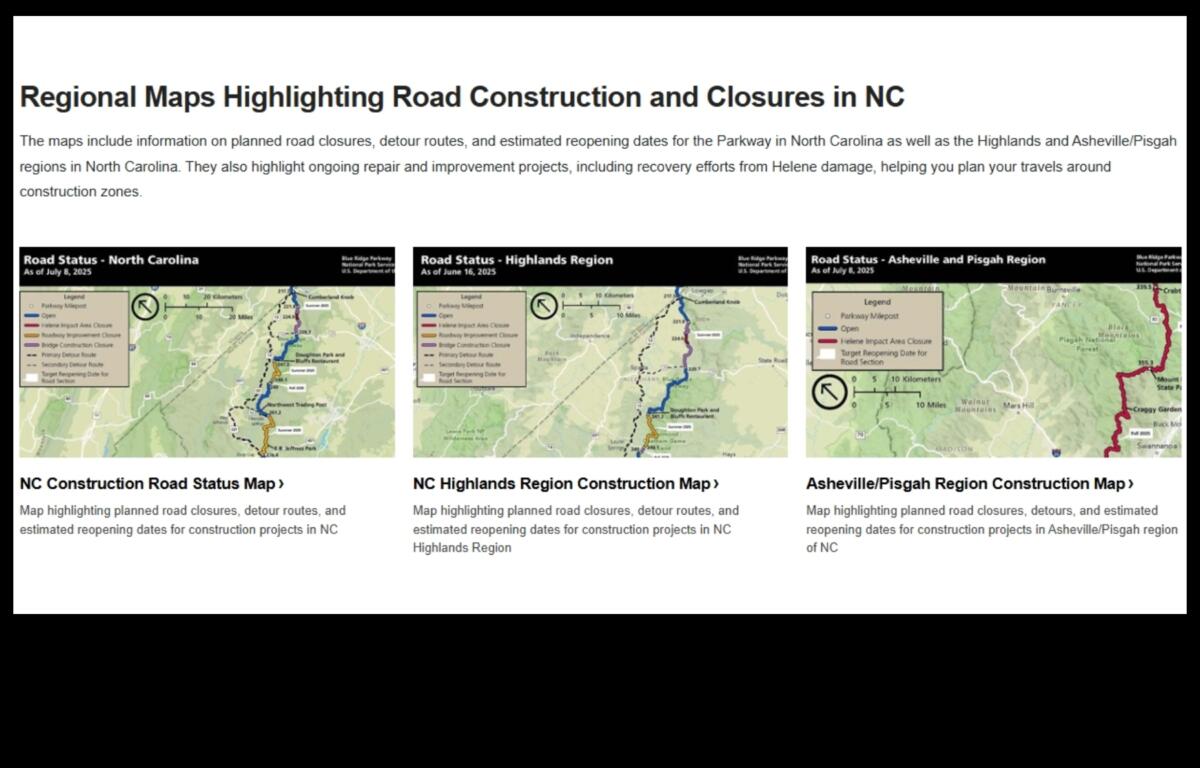 The updated resources, now available on the maps page of the National Park Service’s website, include detailed regional maps for North Carolina, the Highlands area, and the Asheville/Pisgah region. The maps show closures, bridge construction sites and estimated reopening timelines.