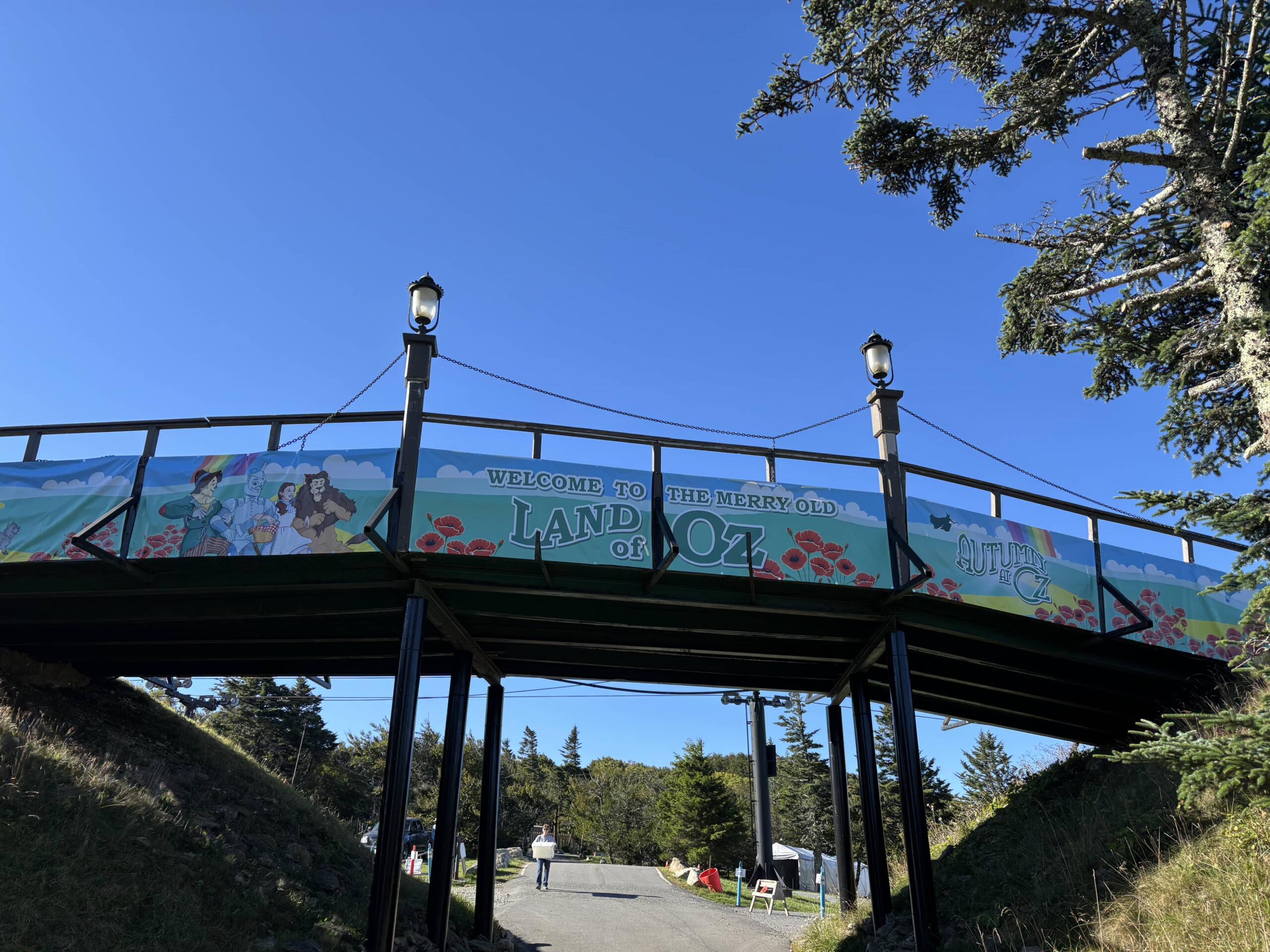 The Land of Oz sign stretches across a Beech Mountain road to welcome visitors into the park.