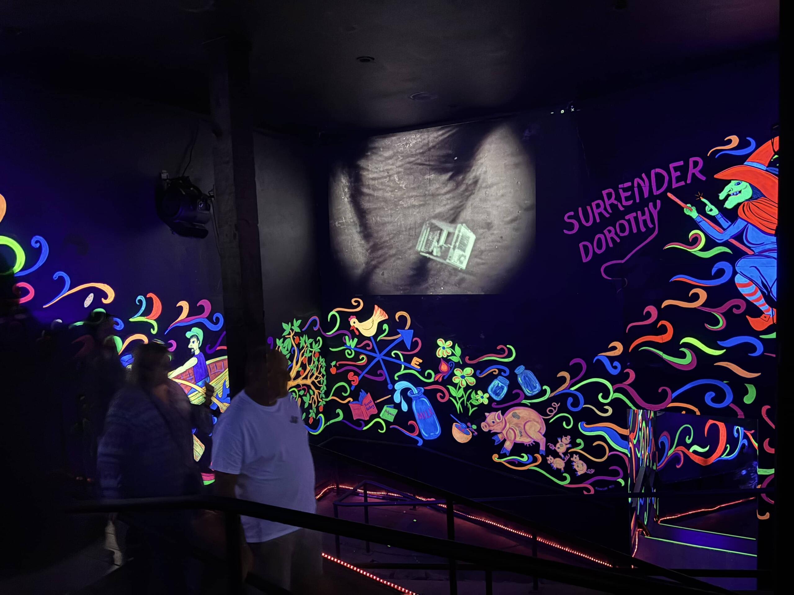 The interior of the Gale farmhouse includes this neon glowing tornado guests must navigate on their way down to Oz.
