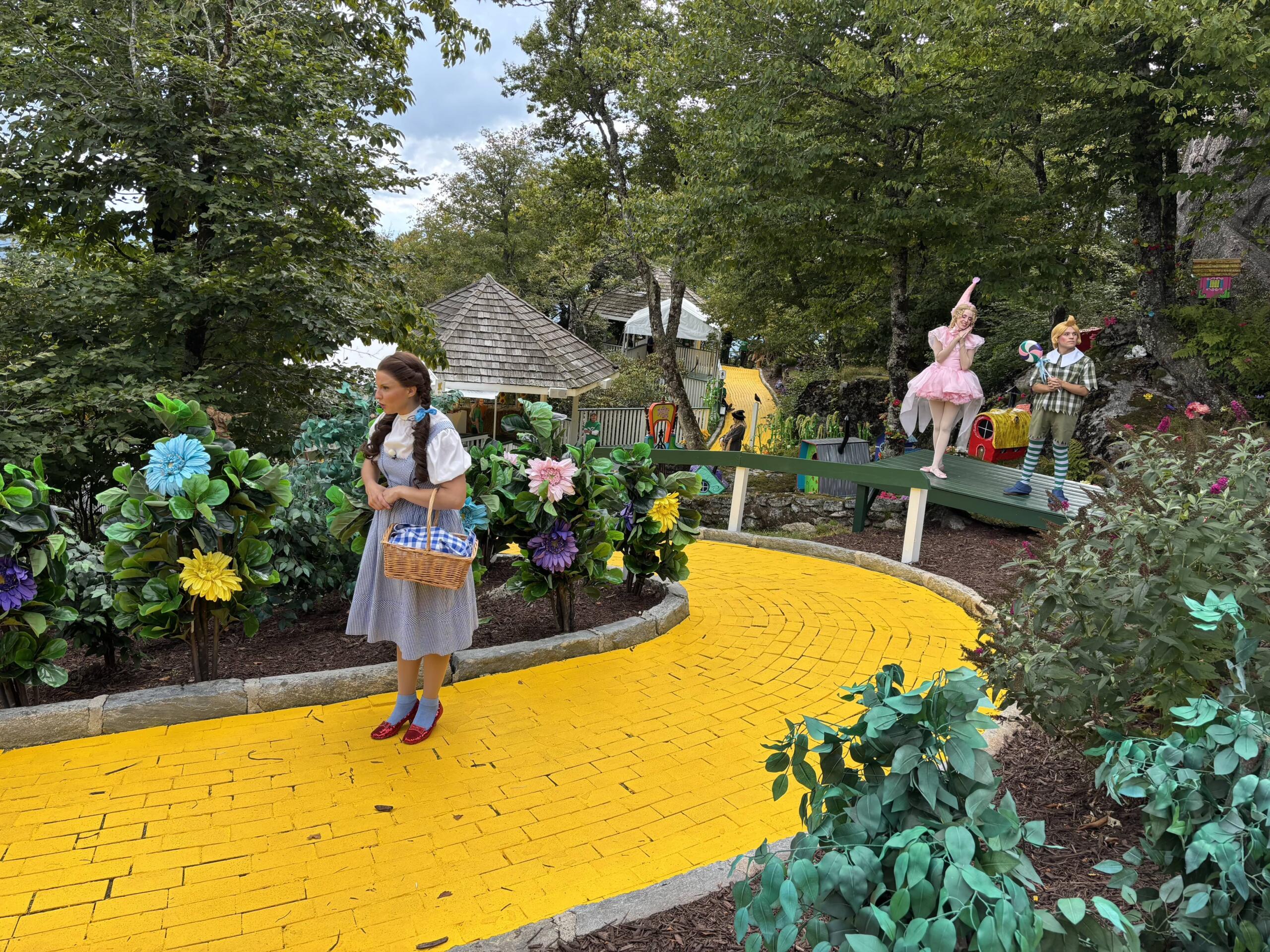 Dorothy stands in Munchkinland, greeting guests after they leave Kansas behind for the Yellow Brick Road.
