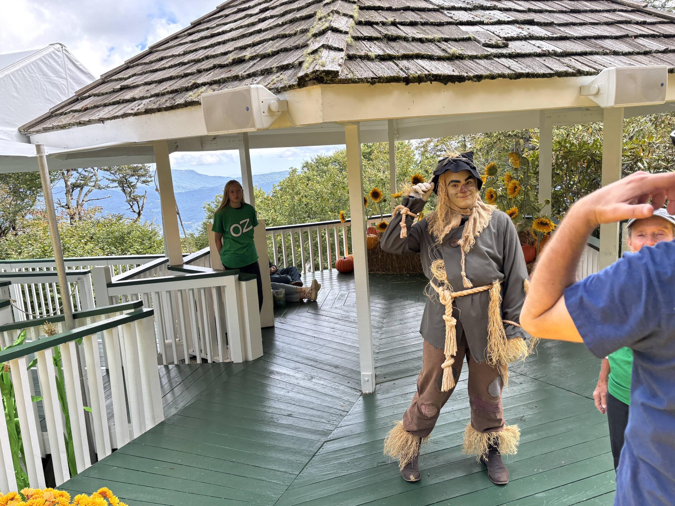 Scarecrow stands in front of his gazebo, where guests can watch his song and grab photos.