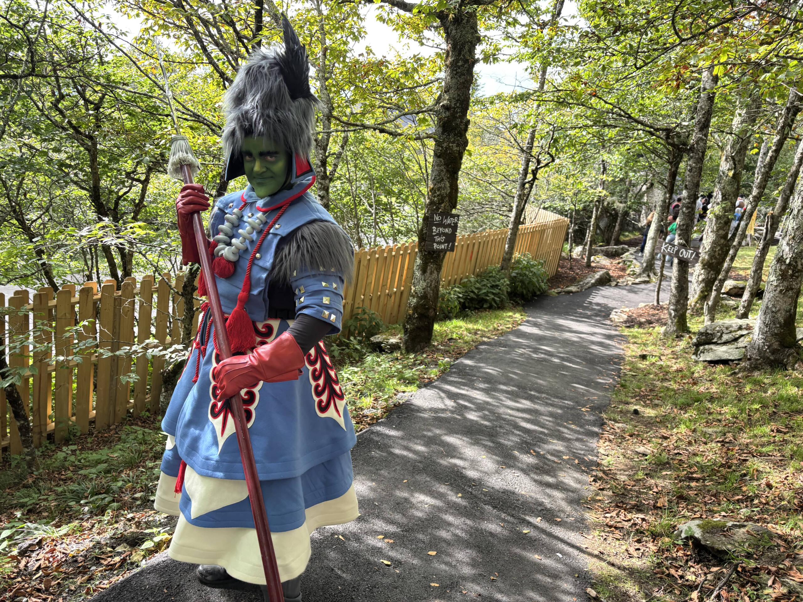 A Winkie Guard stands at attention on the guest path down to the Witch’s castle.