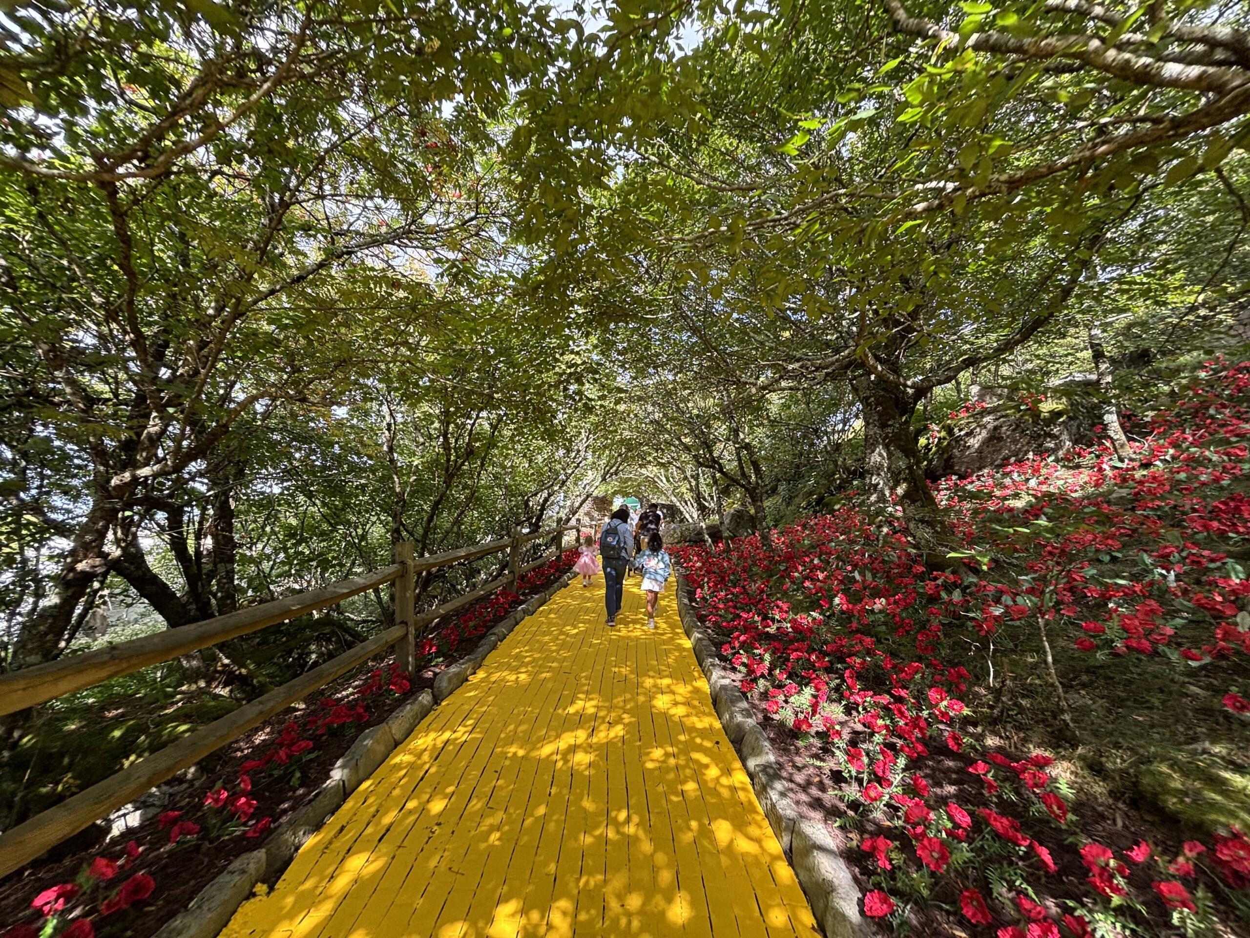 The Yellow Brick Road extends through a field of poppies as guests head up the steepest hill at the Land of Oz.