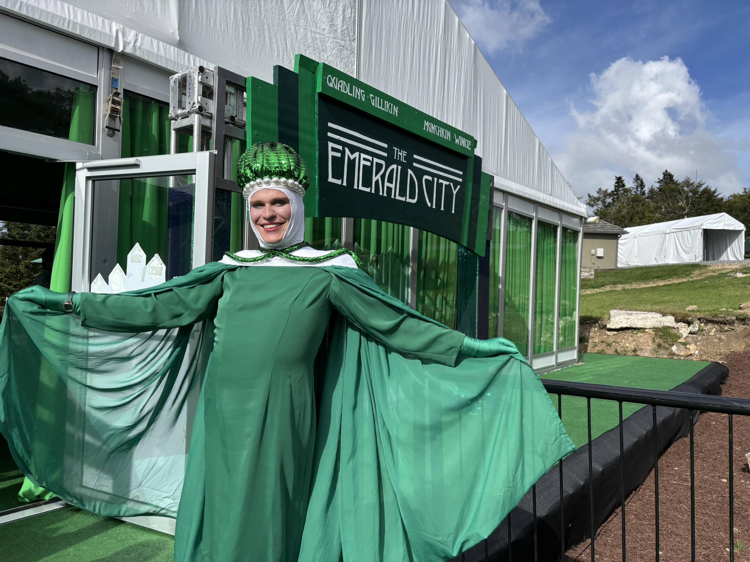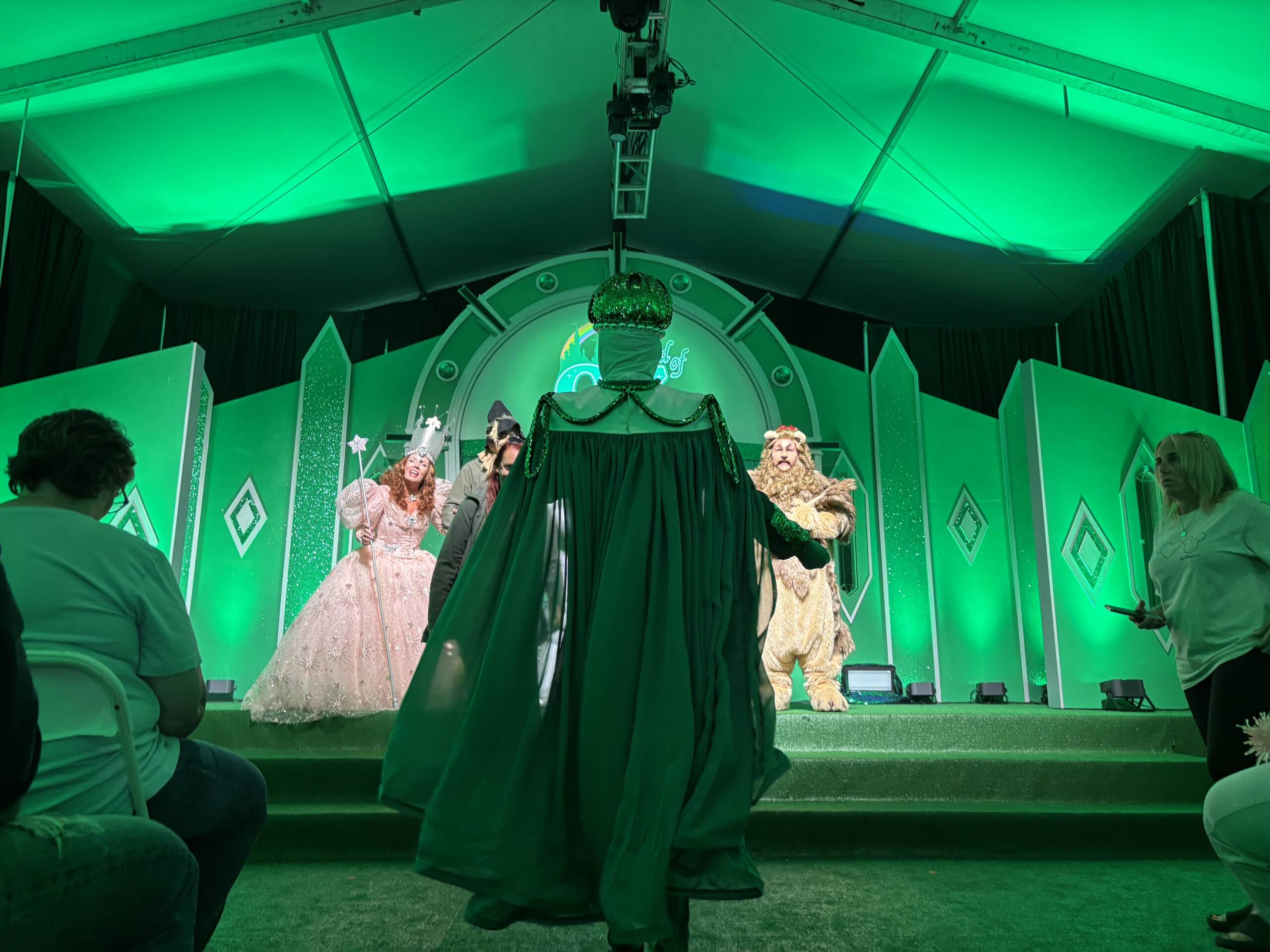 An Emerald Citizen coordinates a photo op as Glenda the Good Witch and the Big Four stand in the Emerald City after a performance.