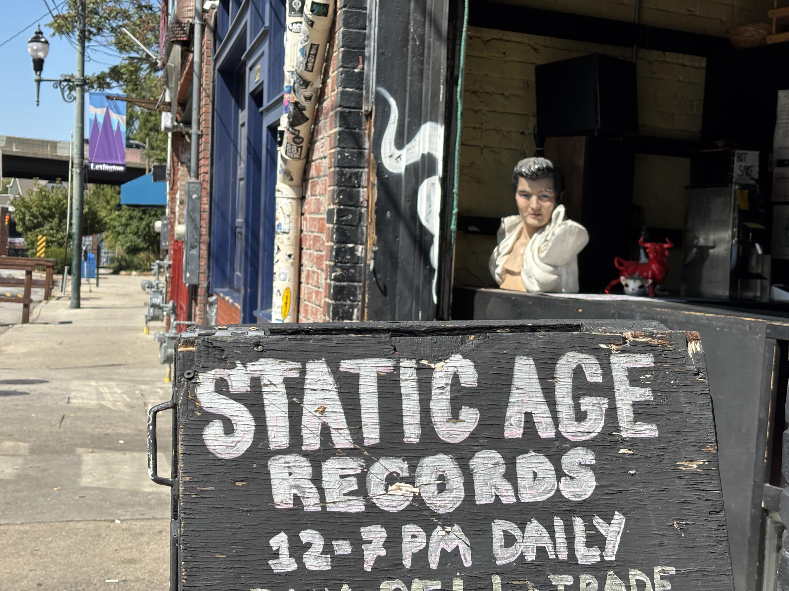 Static Age Records in downtown Asheville has a bust of Elvis looking out over the street.