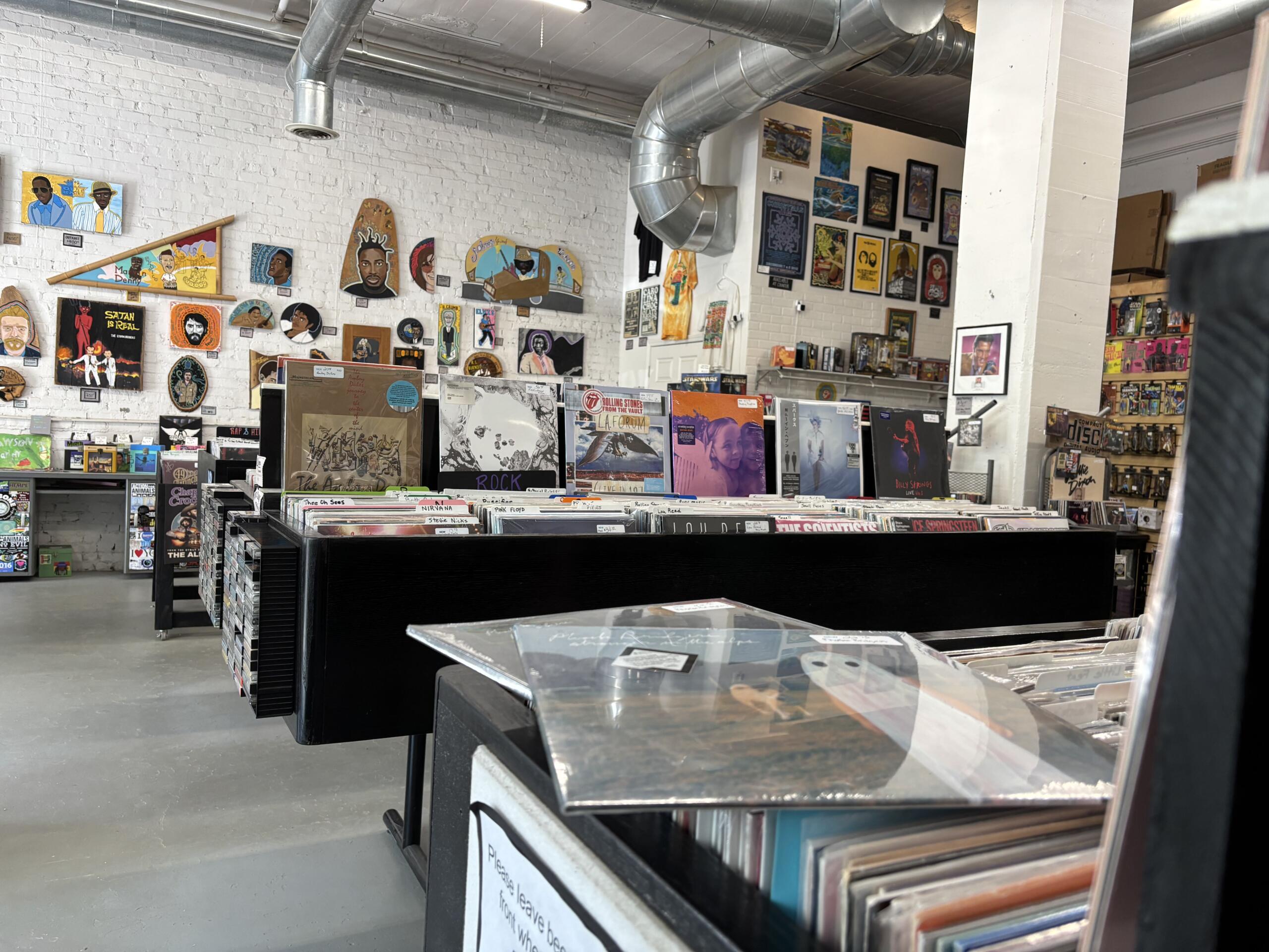 The Records in the RAD show room has a well organized and large collection of vinyl, including these Phoebe Bridgers LPs, as well as local artwork hanging on the walls for sale.