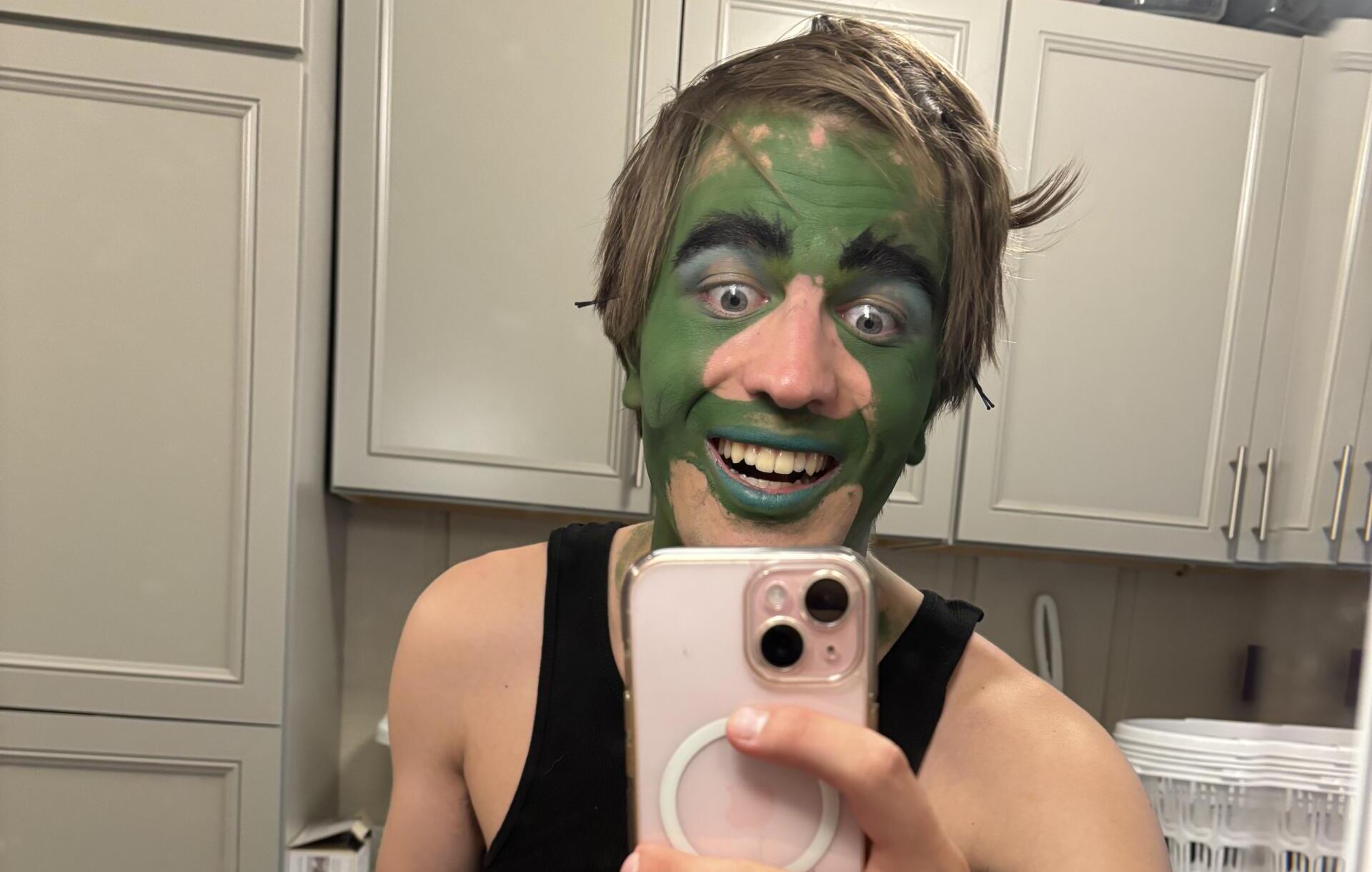 I perform as a Winkie Guard, one of the mean green soldiers the Wicked Witch keeps at her castle – the guys who do the “oh-ee-oh” chant in the movie – and it takes roughly an hour to get my makeup and costume together. There are three Winkies total, and we each require several layers of green face paint, different shades of blue lipstick and dark eye makeup and two prosthetic pieces that are attached to our faces. Getting this all off at the end of the day is its own special experience.