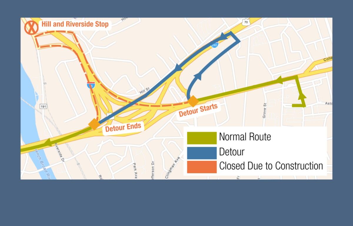 The closures will affect several Asheville Rides Transit routes. Buses on routes WE1, WE2 and W5 will detour by turning right from Patton Avenue onto Haywood Street to access I-240 westbound, rejoining their regular routes near the I-26 and I-240 interchange.