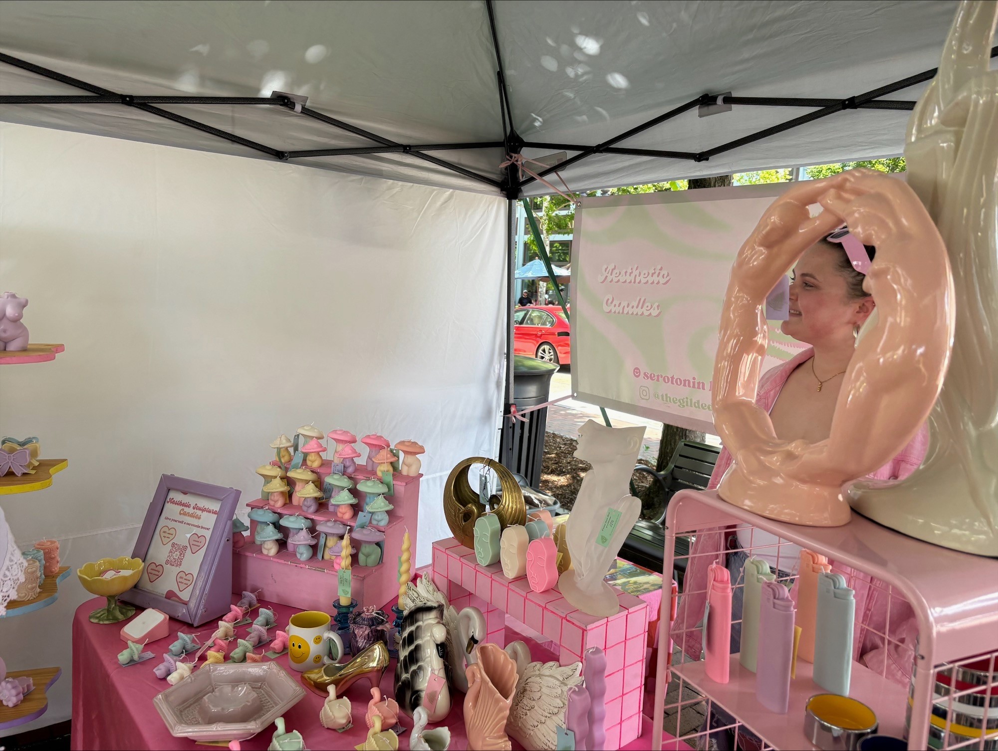 One vendor, Haley Hughes, makes pastel rainbow candles for her tent, Gilded Fern. This was her third time selling with Art in the Park.