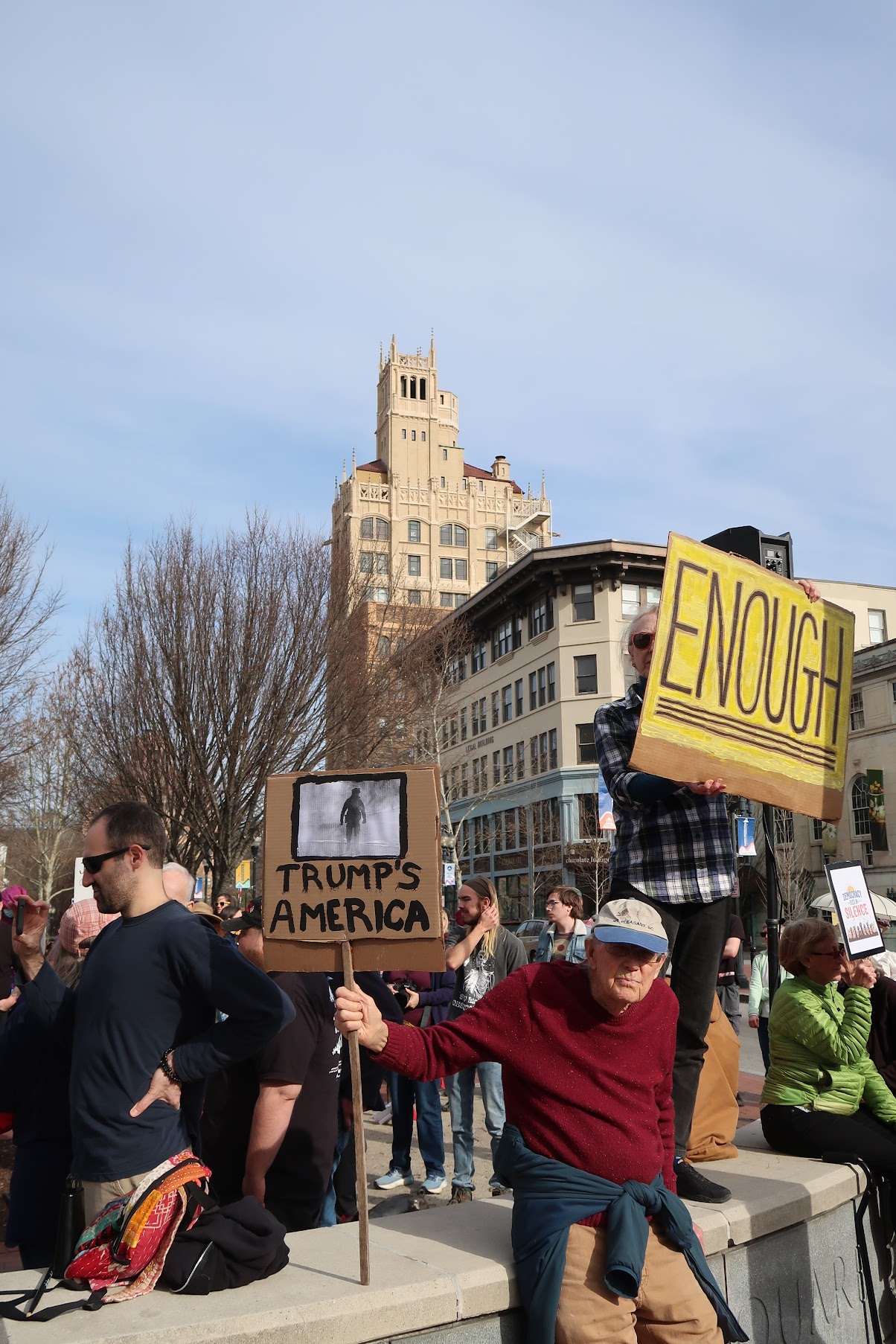 Later, at 3 p.m., a crowd gathered in Pack Square Park with signs and a megaphone, protesting the United States Immigration and Customs Enforcement agency and calling to impeach President Donald Trump.