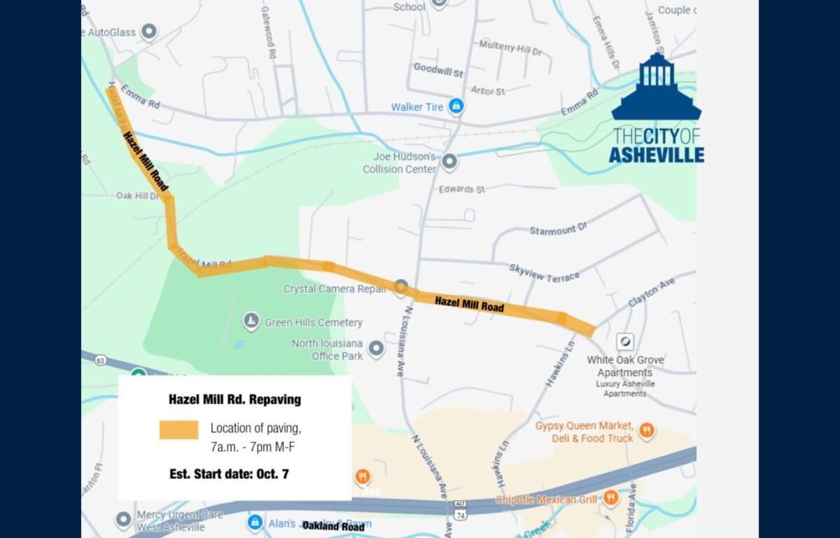 ASHEVILLE, N.C. (828newsNOW) — Resurfacing work on Hazel Mill Road is scheduled to begin Tuesday, Oct. 7, according to the city of Asheville.