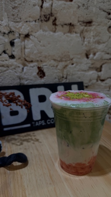 “Pistachio latte with raspberry cold foam” by Layla