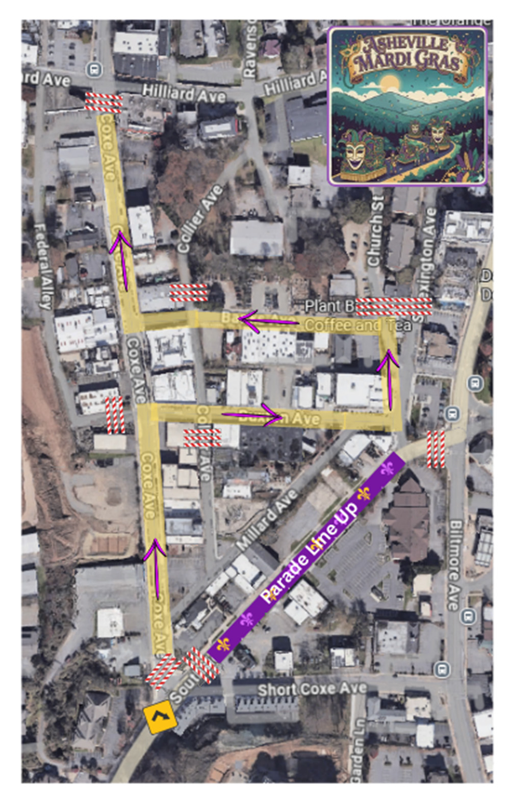 Line up for Mardi Gras marchers and floats will begin at noon, Sunday, Feb. 15, on Southside Avenue. At 3:05 p.m., the parade will begin on the southern end of Coxe Avenue, wrapping around Buxton Avenue and Banks Avenue before wrapping up on the northern end of Coxe Avenue.
