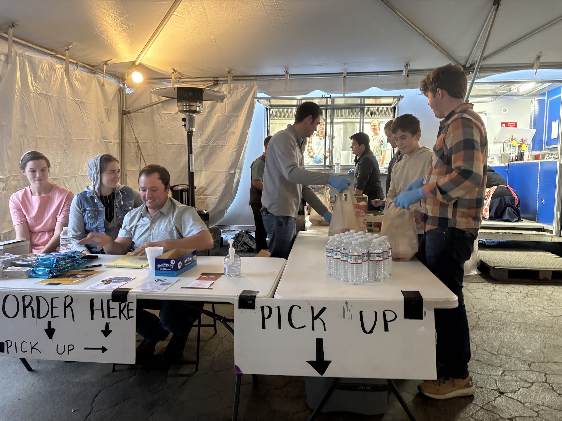 The couple works alongside over 30 people from their church to administer their edible alleviation. Under their tent, people were attentively attending to half a dozen stations, ranging from cleaning ovens and boxing food to creating handwritten notes to accompany the meals.