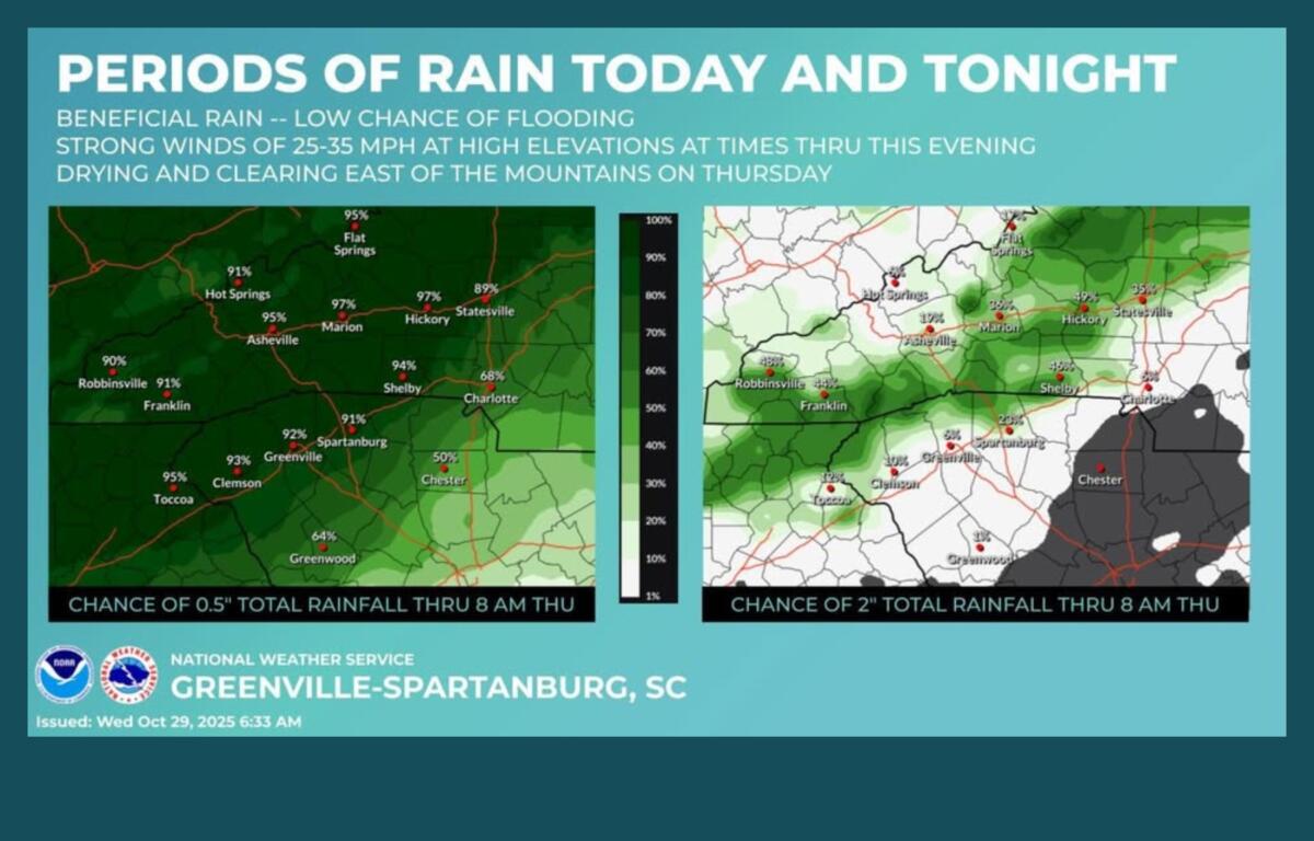 The National Weather Service says to expect occasional drizzle and sprinkles early Wednesday, with heavier rainfall expected by late afternoon and continuing into the night. Most areas could see at least half an inch of additional rain, while the southern and eastern mountains and foothills may receive 1 to 2 inches. Isolated flash flooding remains possible along the east-facing slopes of the Blue Ridge Escarpment, though the risk at any one location is below 5 percent.