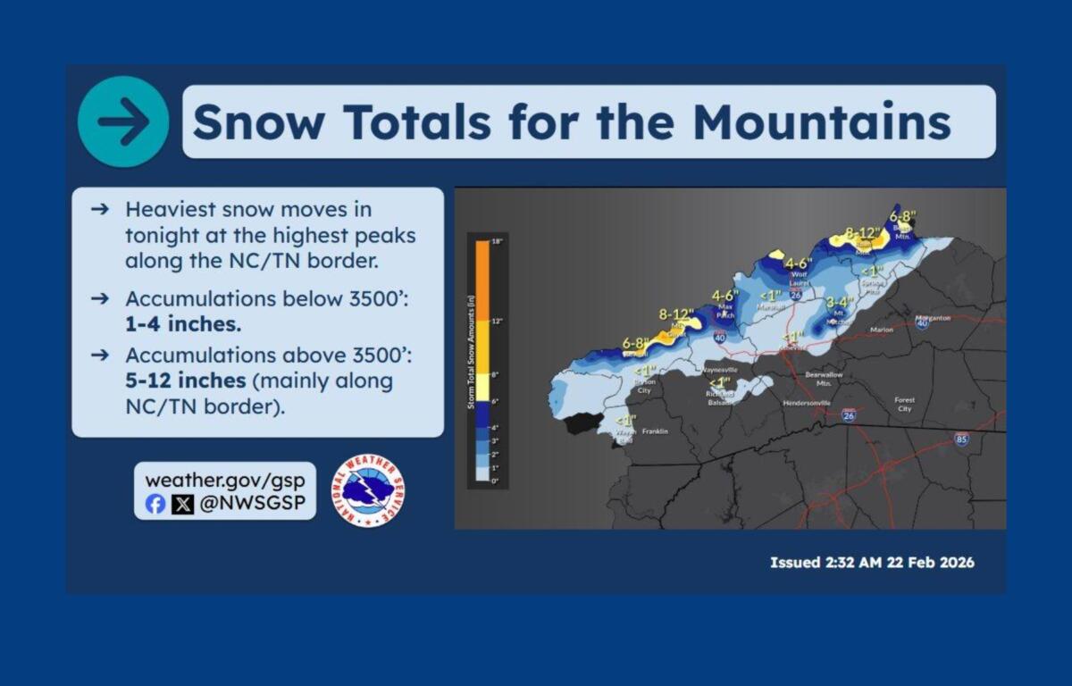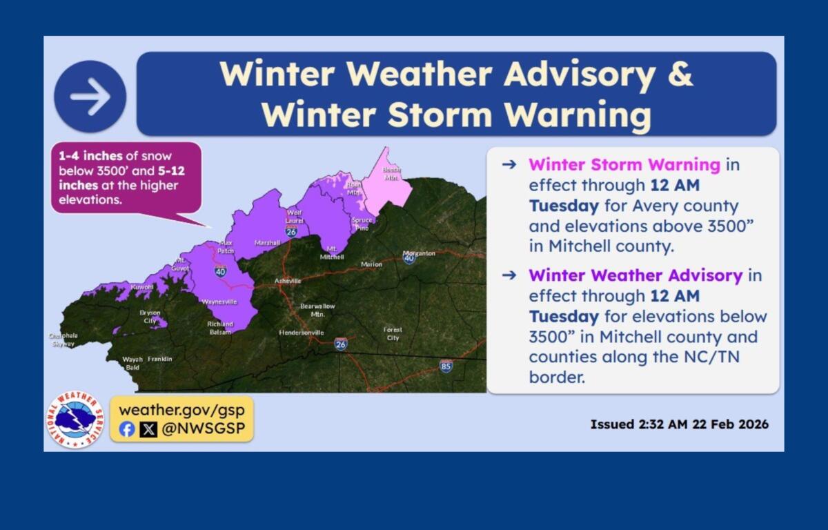 In Swain County, a Winter Weather Advisory remains in effect above 3,500 feet. Forecasters say 3 to 7 inches of snow are likely in most higher elevations, with a foot or more possible on the highest peaks of the Smokies. Valley areas beneath the Smokies could see up to an inch of accumulation.