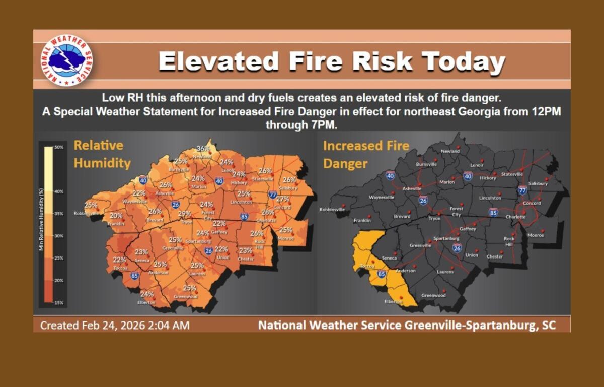 Relative humidity levels are forecast to drop into the 15 percent to 20 percent range in parts of northeast Georgia, with 20 percent to 25 percent elsewhere across the coverage area. Winds are expected to shift to the southwest by afternoon, with gusts between 10 and 15 mph. The combination of low humidity and dry fuels will make outdoor burning dangerous, officials said.