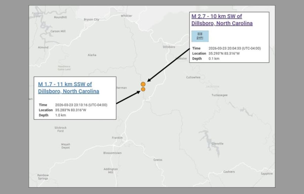 ASHEVILLE, N.C. (828newsNOW) — Two small earthquakes were recorded Monday evening near the Macon-Jackson county line in the North Carolina mountains, according to federal officials.