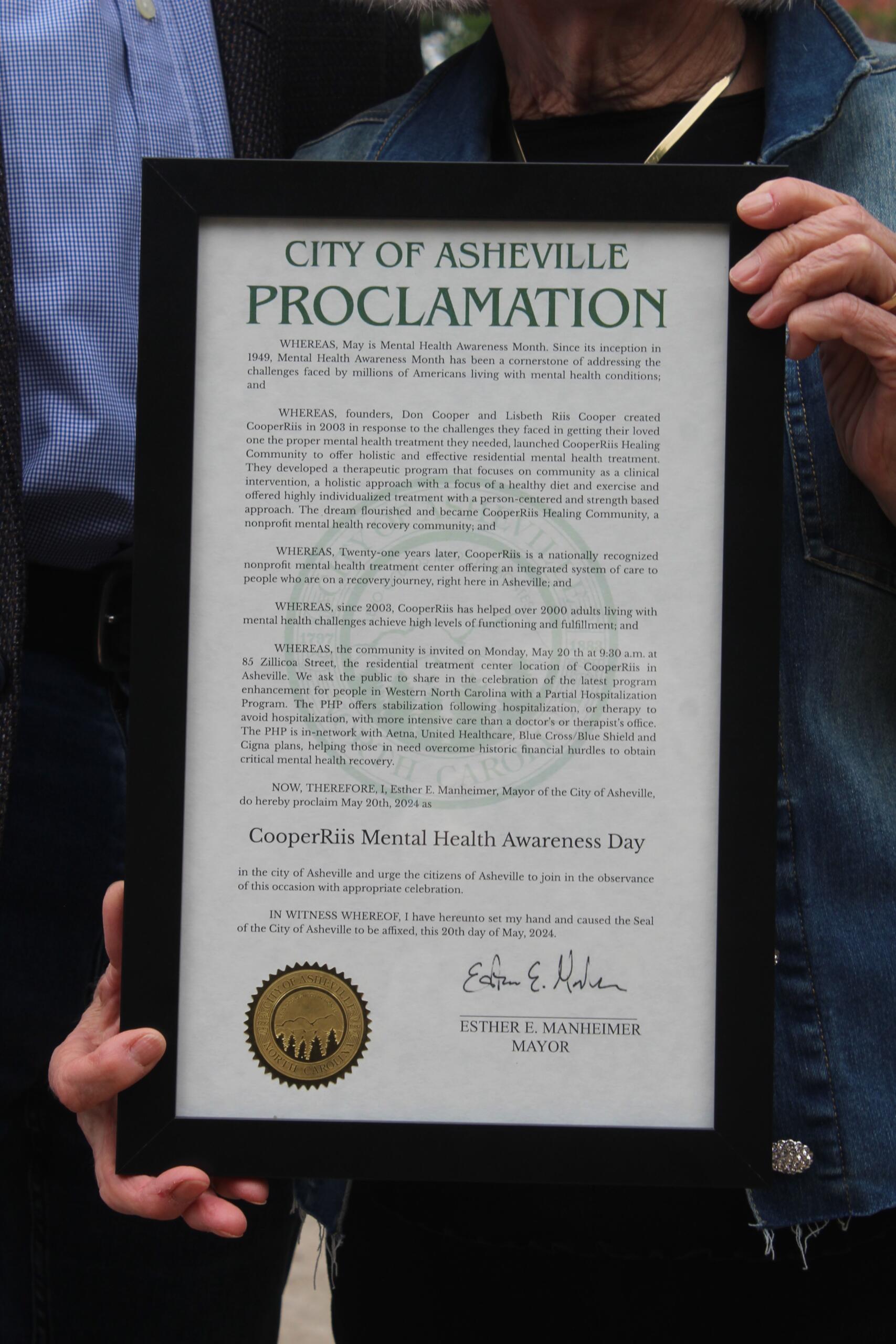 At a courtyard event Monday outside Brower Hall, Levine presented the founders with a proclamation signed by Asheville Mayor Esther E. Manheimer declaring Monday, May 20, 2024, to be CooperRiis Mental Health Awareness Day.