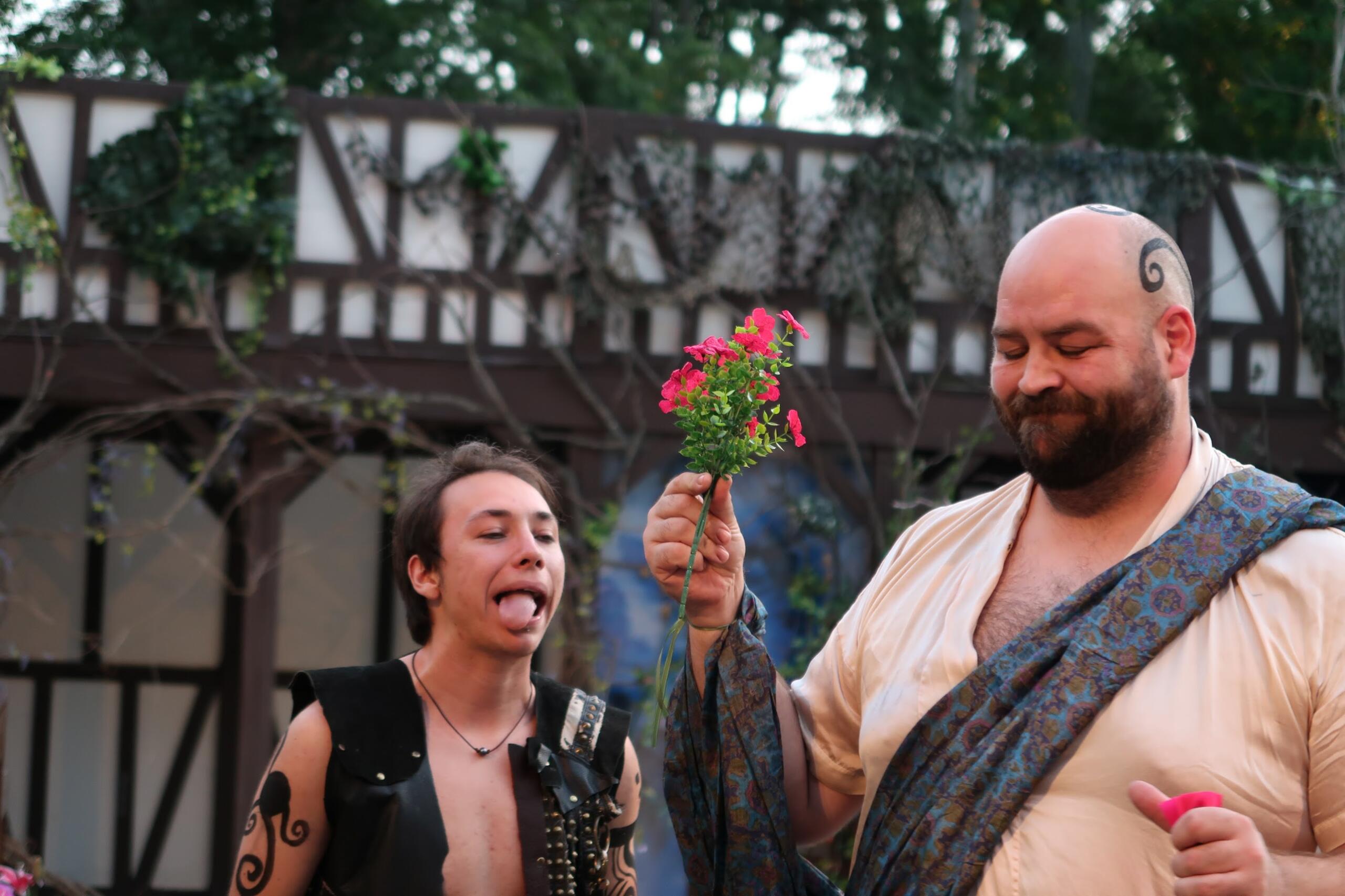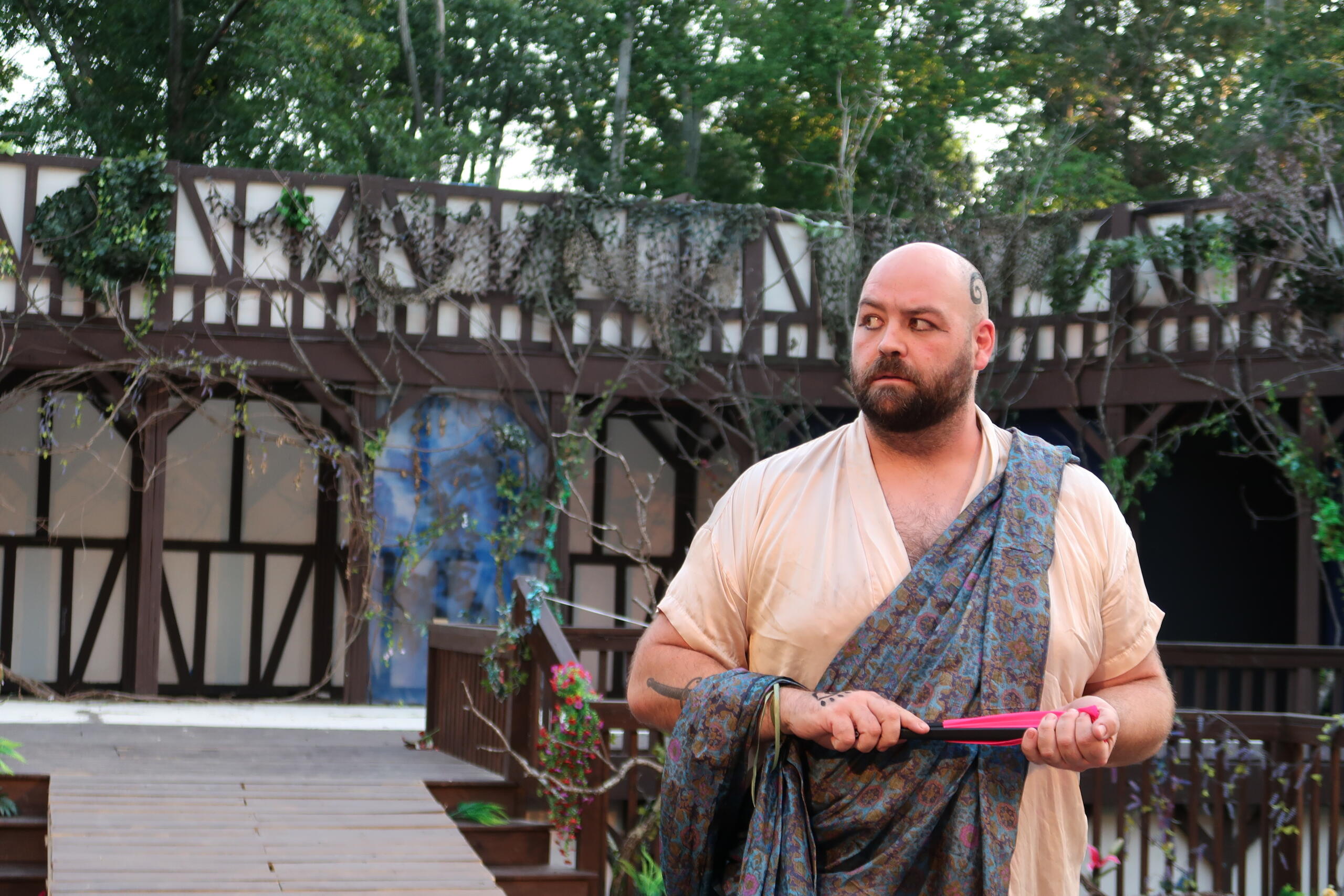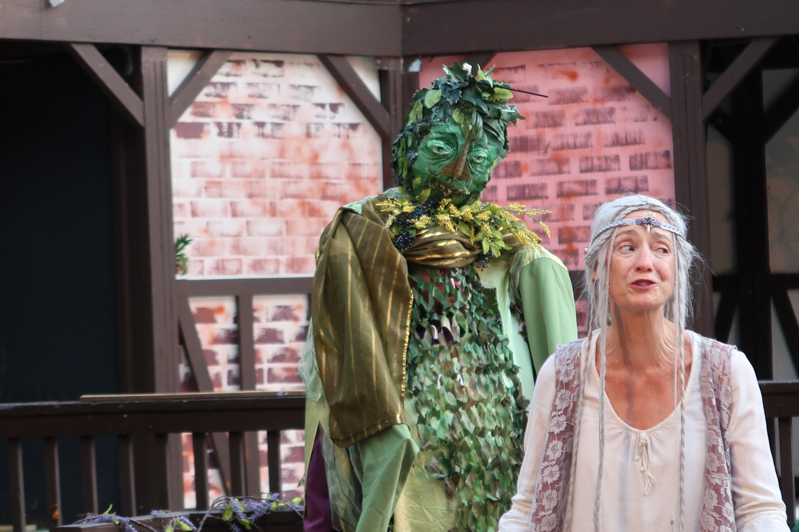 However, despite the incongruous feel of the wardrobe, the faerie costumes, designed by Kelly Chambers, are undeniably gorgeous, with actors covered in swirling black tattoos and evocations of forest creatures. Several faerie actors had costumes enhanced by incredible-looking puppets, such as Snot Otter the Hellbender, designed by Nicole Schilling, built by Emily Dake and performed by Helen Mauro. The faeries excelled in selling the stage’s transformation into the magical forest, aided by a fantastic act of vine-draped set design by Grant.
