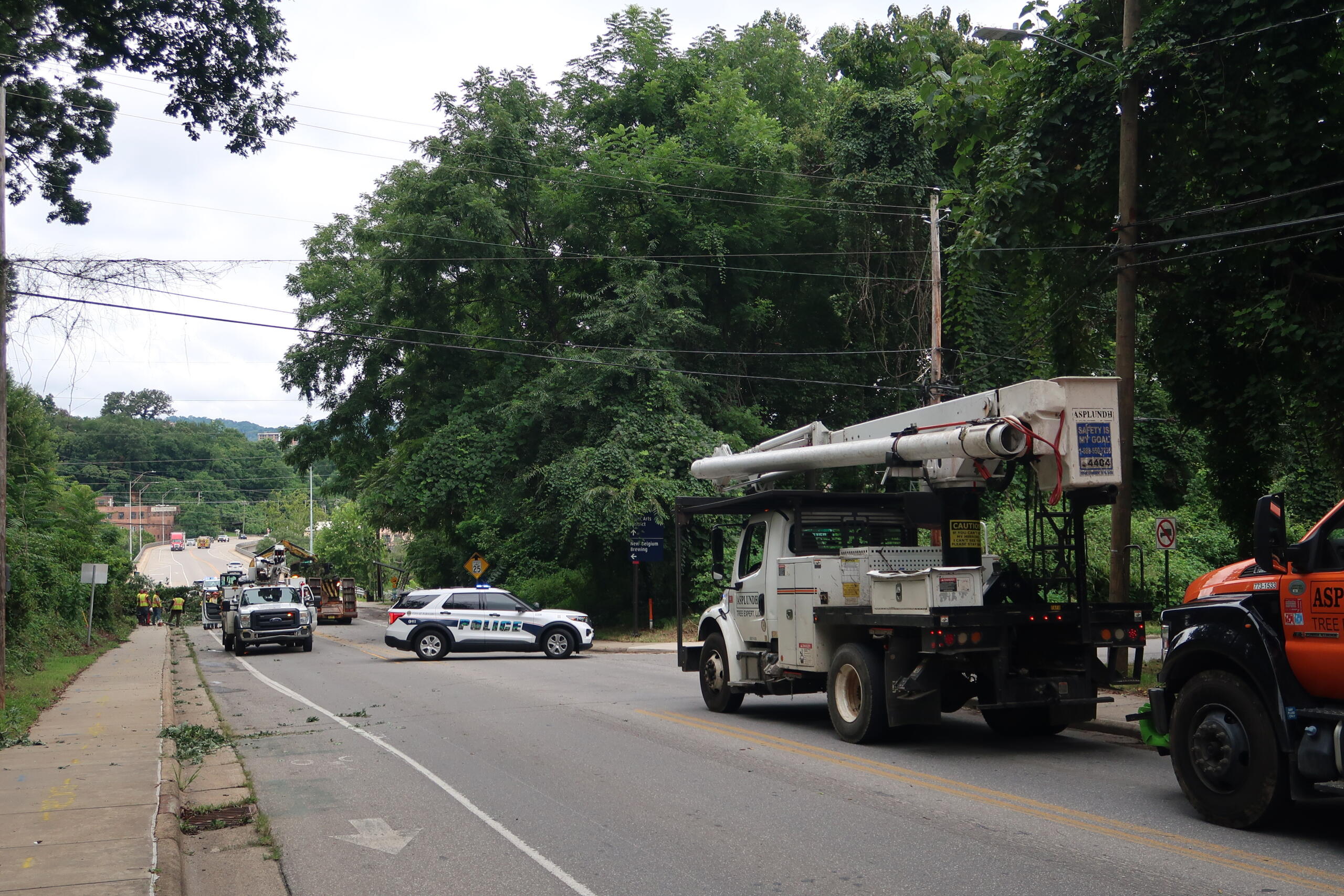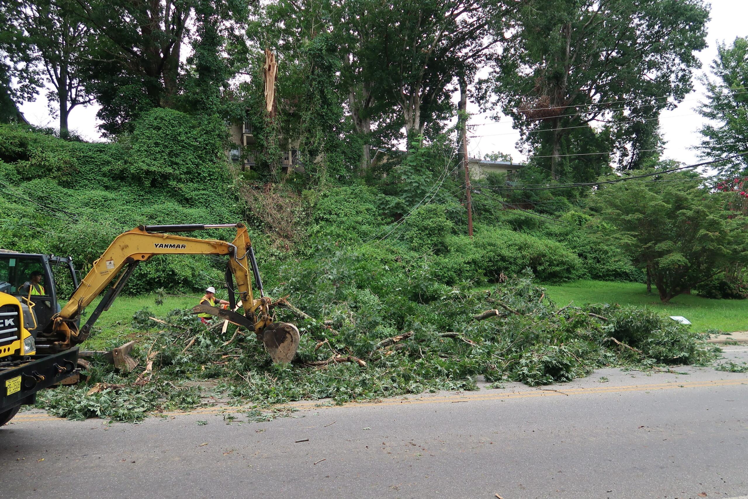 Around 3:30 p.m., a police vehicle had blocked the segment of Haywood Road with the fallen debris. EMT services and the ART bus were no longer located at the scene, but Duke Energy and cleanup crews were present.