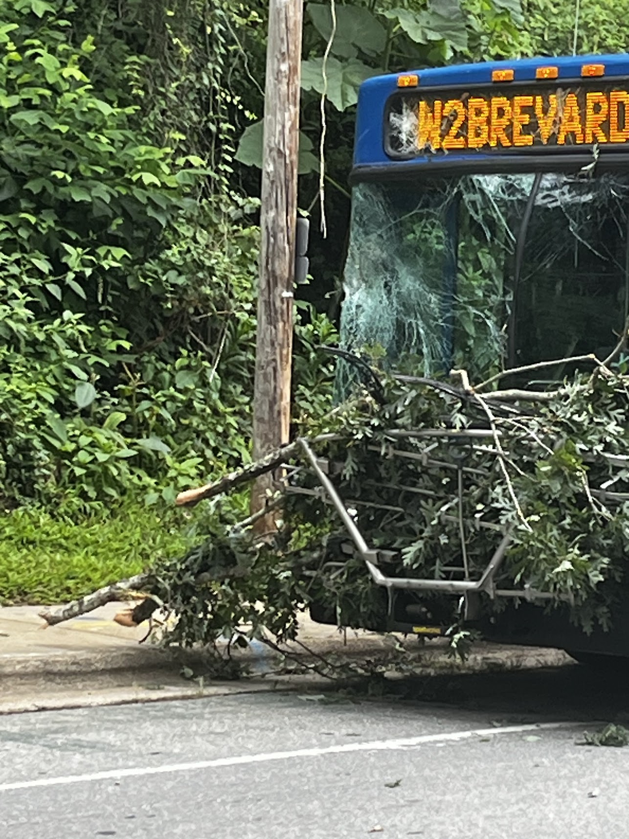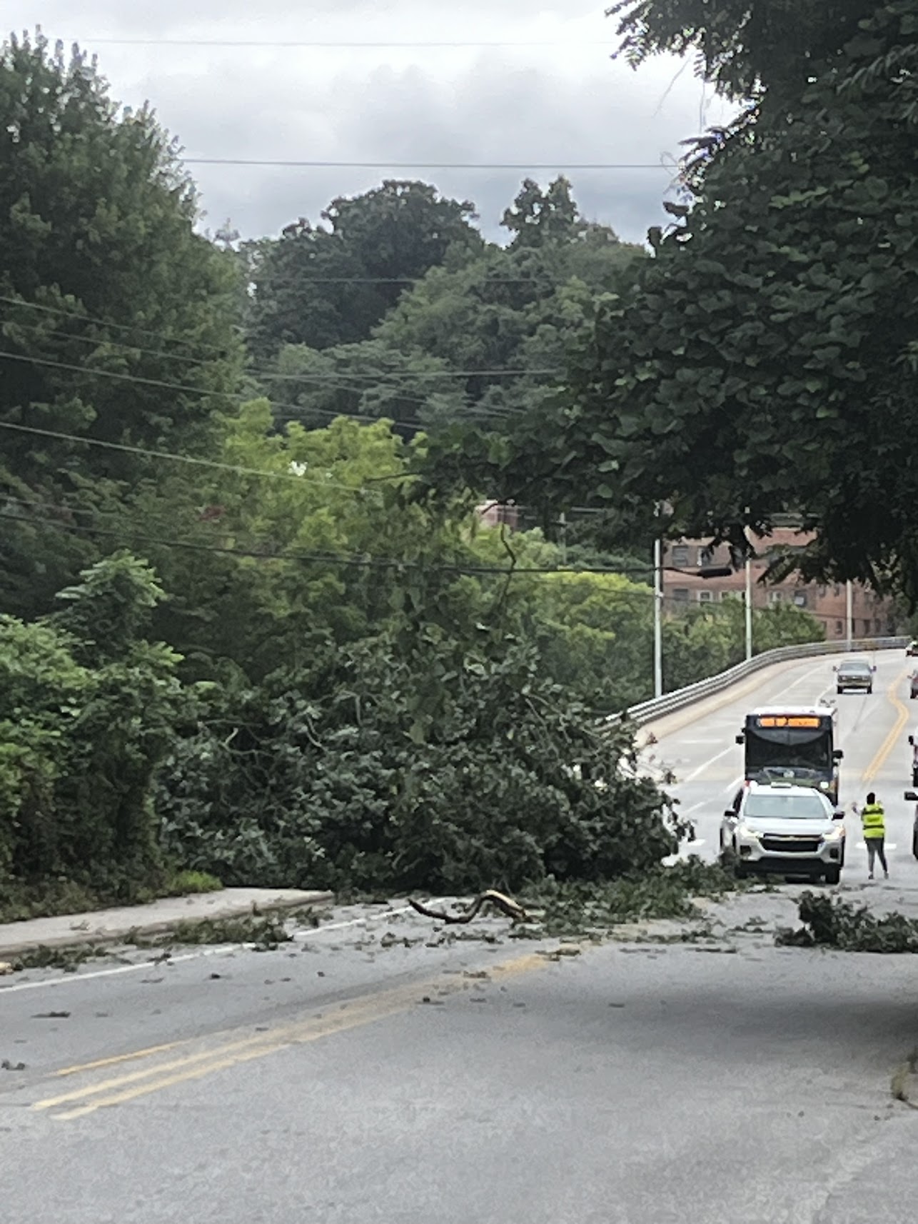 Around 2:30 p.m. today, Tuesday, Aug. 5, a tree fell unexpectedly on Haywood Road, damaging an ART bus and knocking out power in nearby businesses.