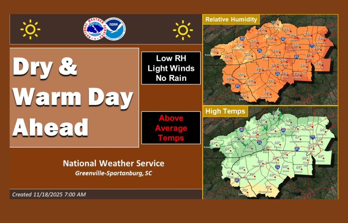Forecasters with the NWS Greenville-Spartanburg office said temperatures will rise above normal with mostly dry conditions, though a few showers could develop overnight in the North Carolina mountains. Relative humidity levels are expected to drop below 25 percent in some areas Tuesday afternoon and evening — a key factor in increasing wildfire risk.