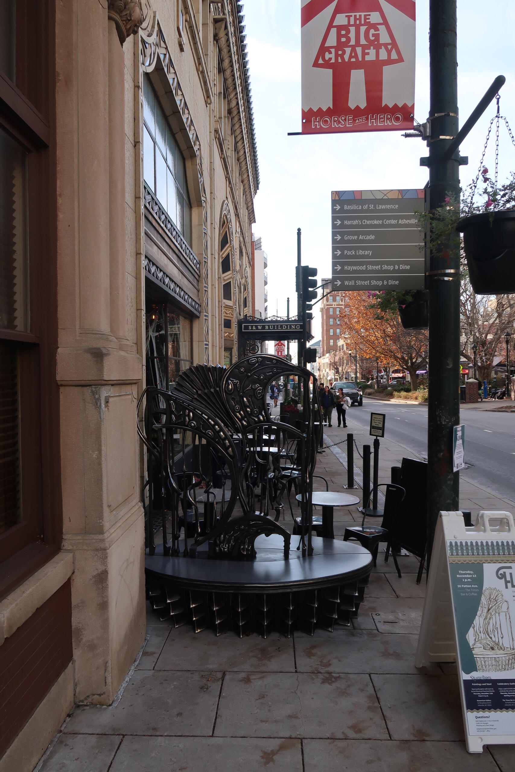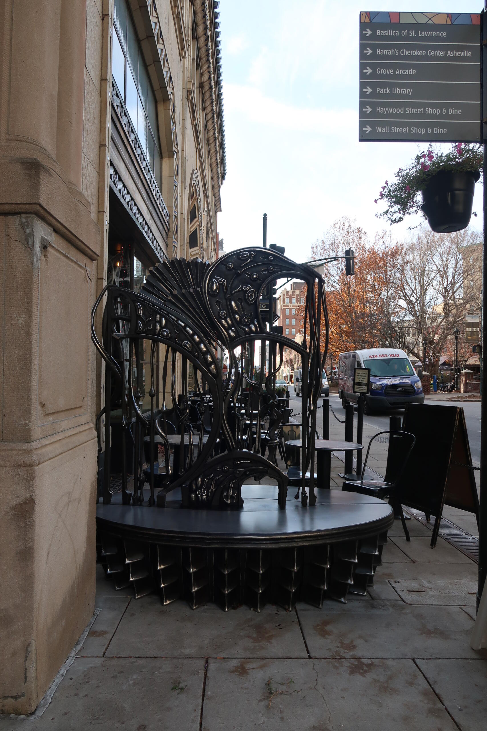 “Fluvial,” simultaneously an art installation and public seating, was designed, installed and crafted by Red Metal artist Rachel David. The piece is located to the immediate left of The Times Bar & Coffee at 56 Patton Ave.