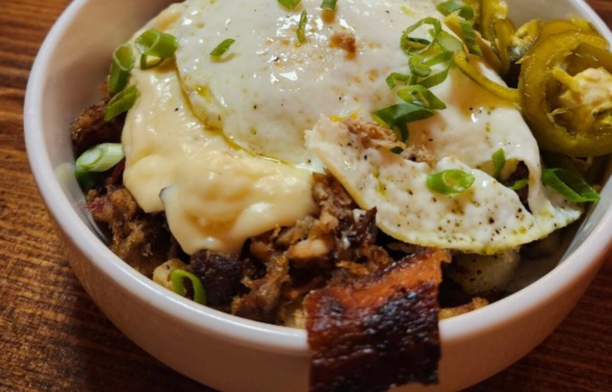 She chose the pork hash –a pork loin hash with two sunny-side-up eggs, bacon, jalapeño, home fries and cheese sauce. It was absolutely delicious.