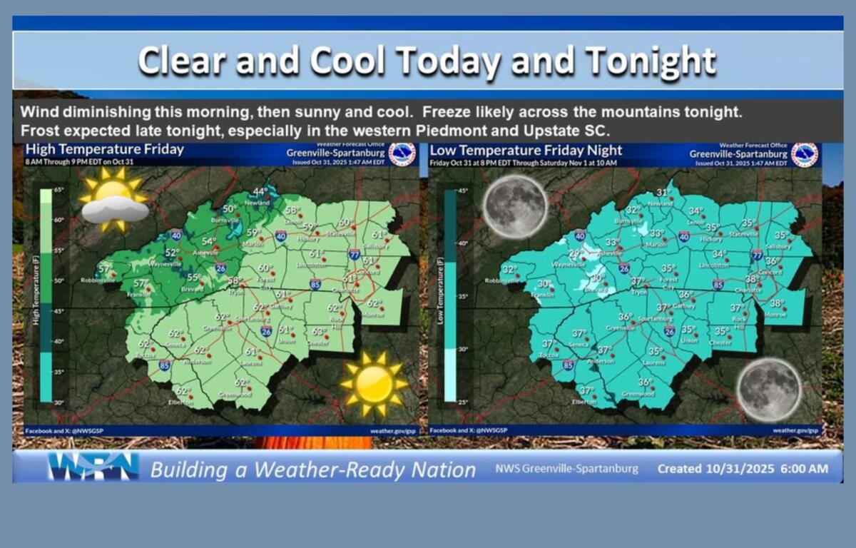 The chill follows a windy Halloween morning that prompted a Wind Advisory for Avery, Mitchell and Yancey counties, with gusts up to 45 mph. Winds are expected to calm by afternoon, leading to a clear, cool day with highs near 55 degrees in Asheville and surrounding areas.