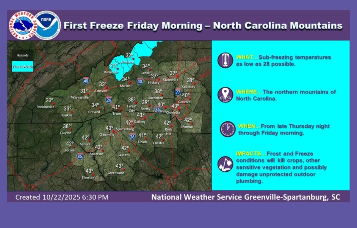The National Weather Service in Greenville-Spartanburg has issued the first Freeze Warning of the season for several mountain counties, including Buncombe, Haywood, Madison, Swain, Macon and parts of Burke, Caldwell, Graham, Jackson and McDowell. Temperatures are expected to dip as low as 29 degrees, with the warning in effect from 2 a.m. to 9 a.m. Friday.