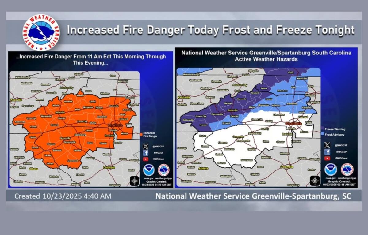 The National Weather Service in Greenville-Spartanburg has issued the first Freeze Warning of the season for several mountain counties, including Buncombe, Haywood, Madison, Swain, Macon and parts of Burke, Caldwell, Graham, Jackson and McDowell. Temperatures are expected to dip as low as 29 degrees, with the warning in effect from 2 a.m. to 9 a.m. Friday.