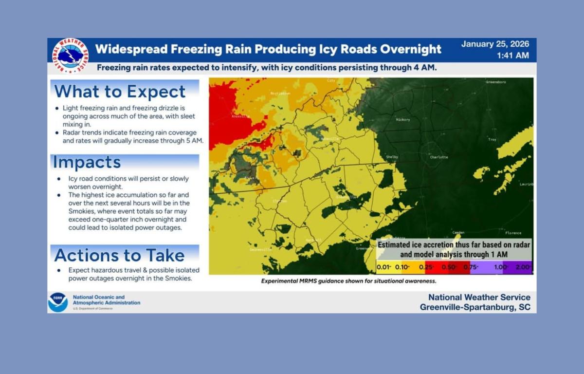 The National Weather Service in Greenville-Spartanburg said freezing rain and freezing drizzle were ongoing across much of the region, with icy roads already developing. Forecasters said radar trends indicate the coverage and intensity of freezing rain are expected to increase overnight, leading to worsening travel conditions into the early morning hours.