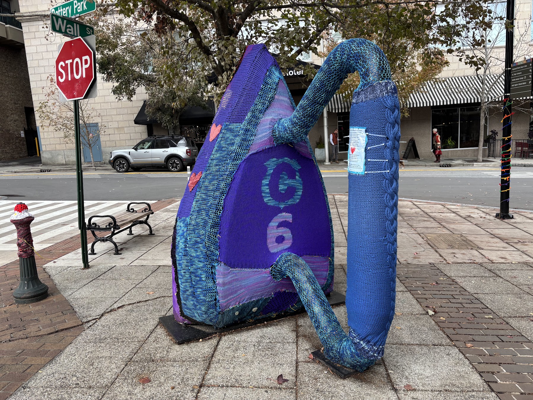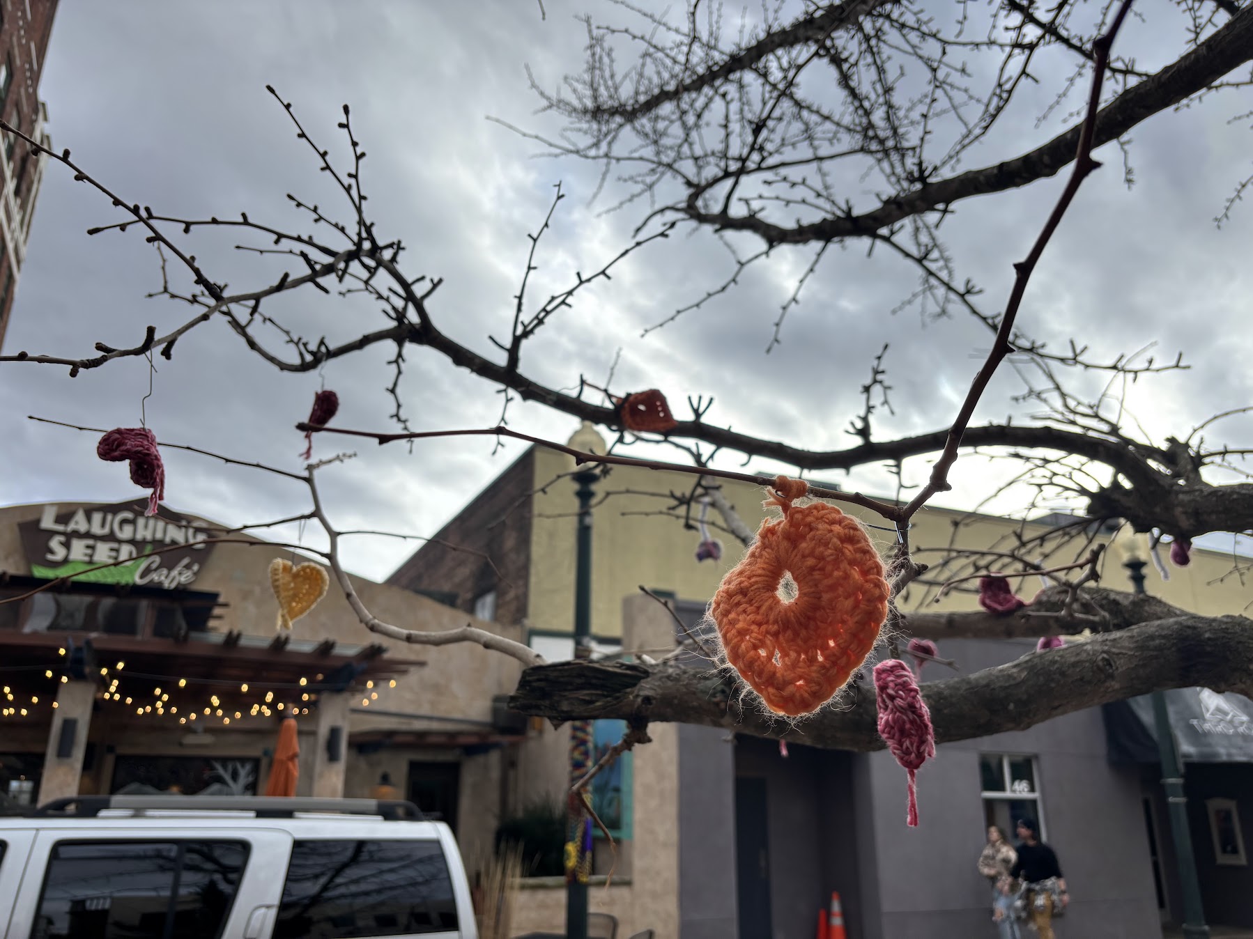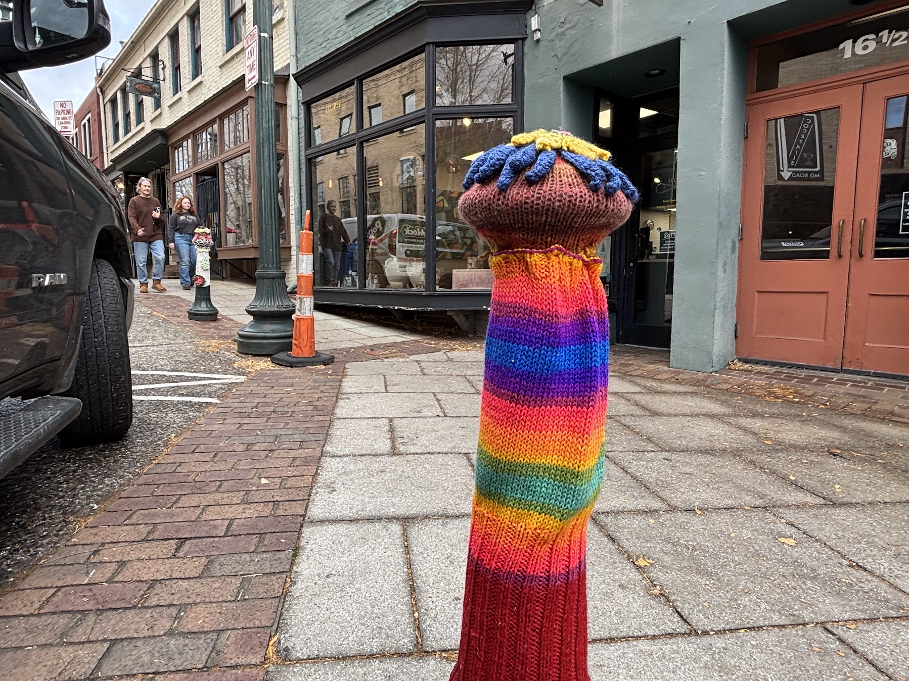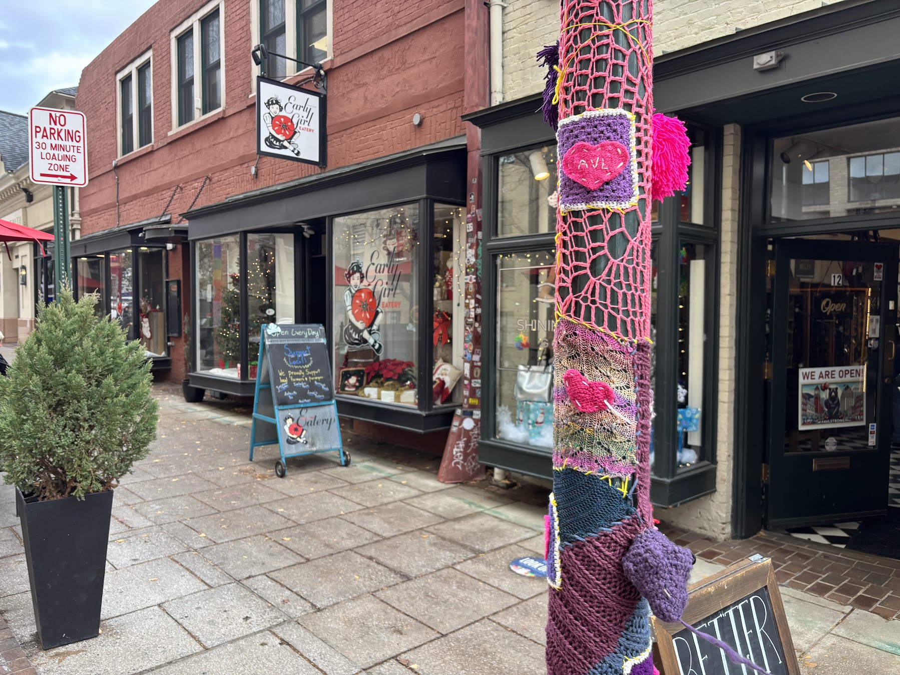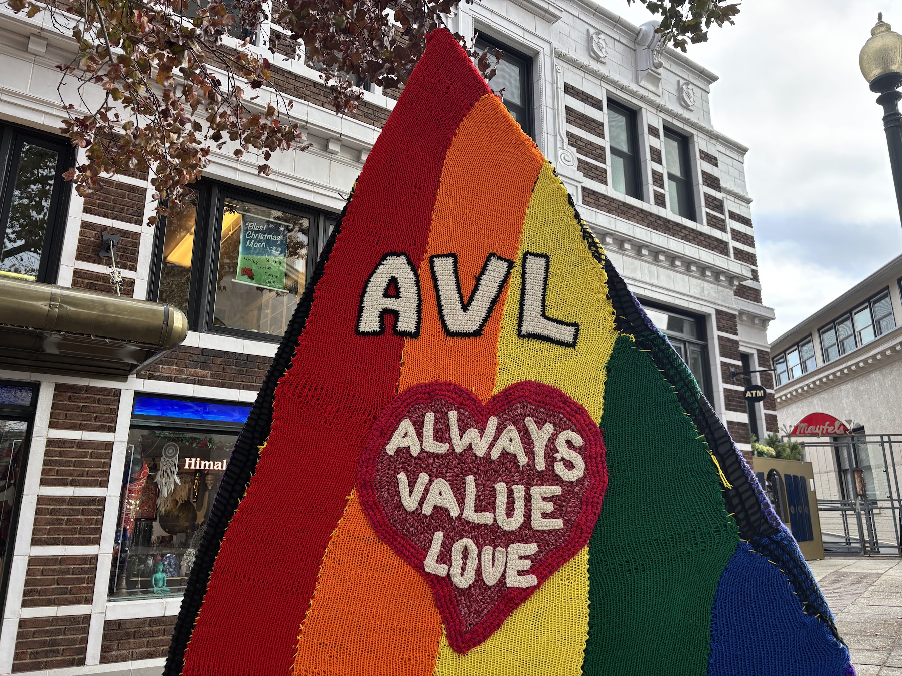 The “Yarn Bomb of Love” on Wall Street in downtown Asheville is free to view for the community.