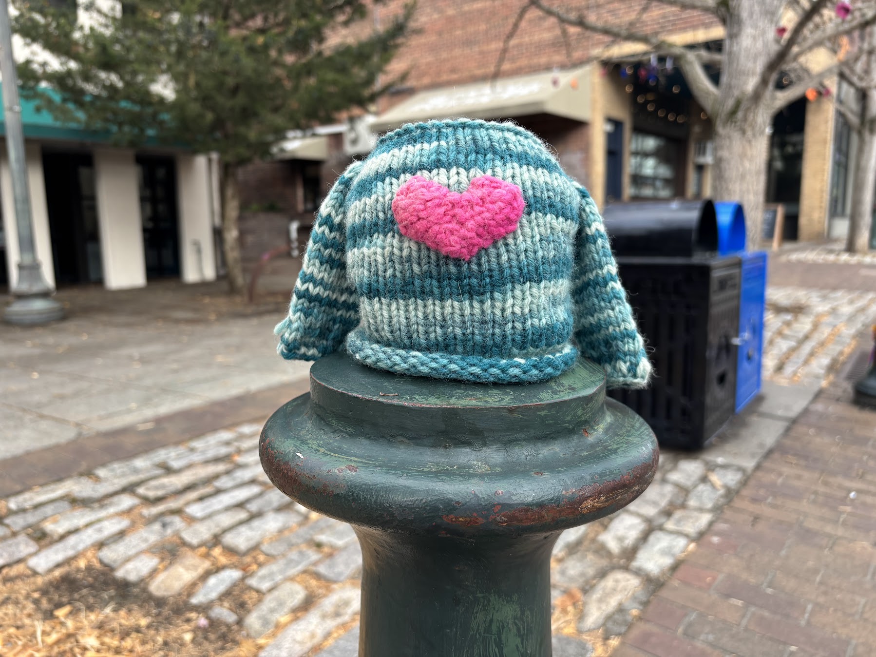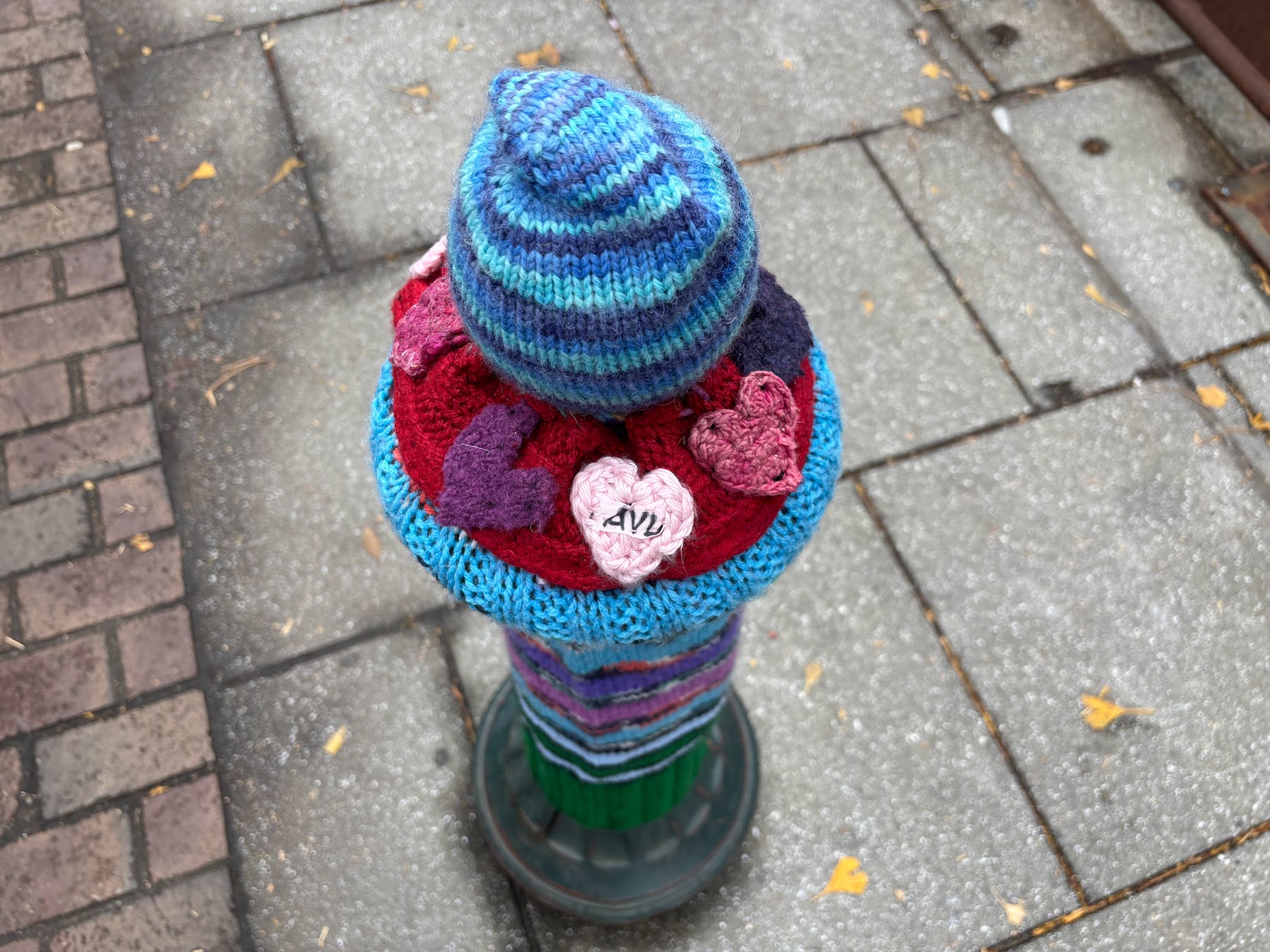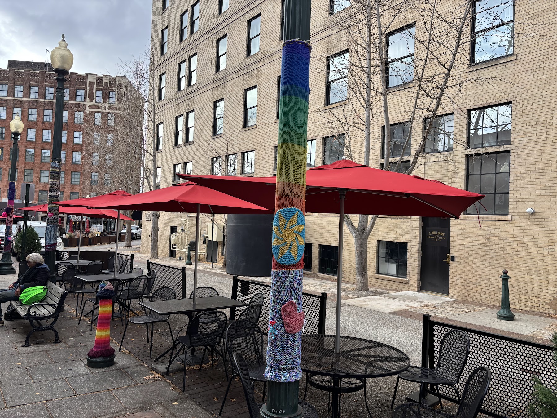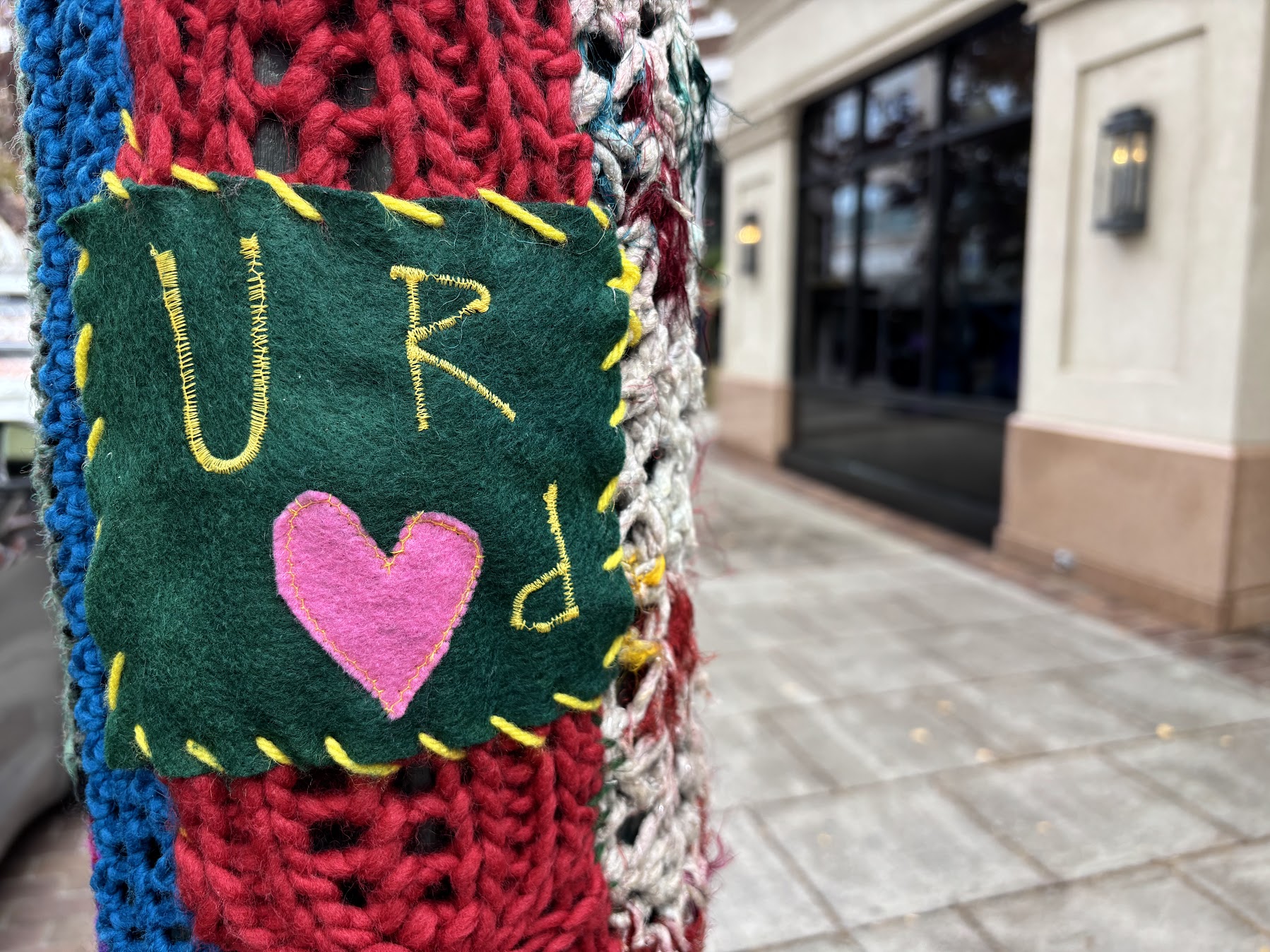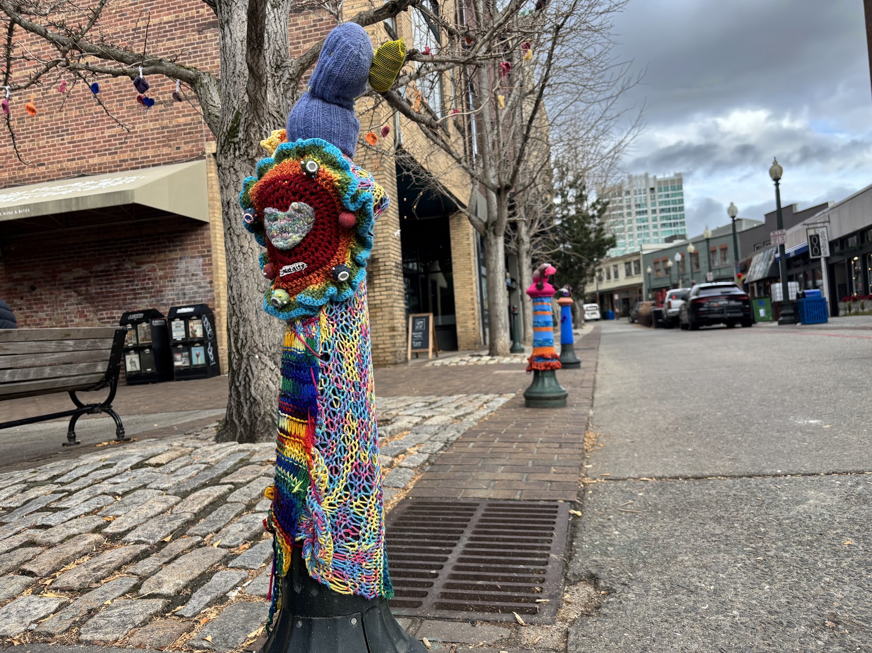 The “Yarn Bomb of Love” on Wall Street in downtown Asheville is free to view for the community.