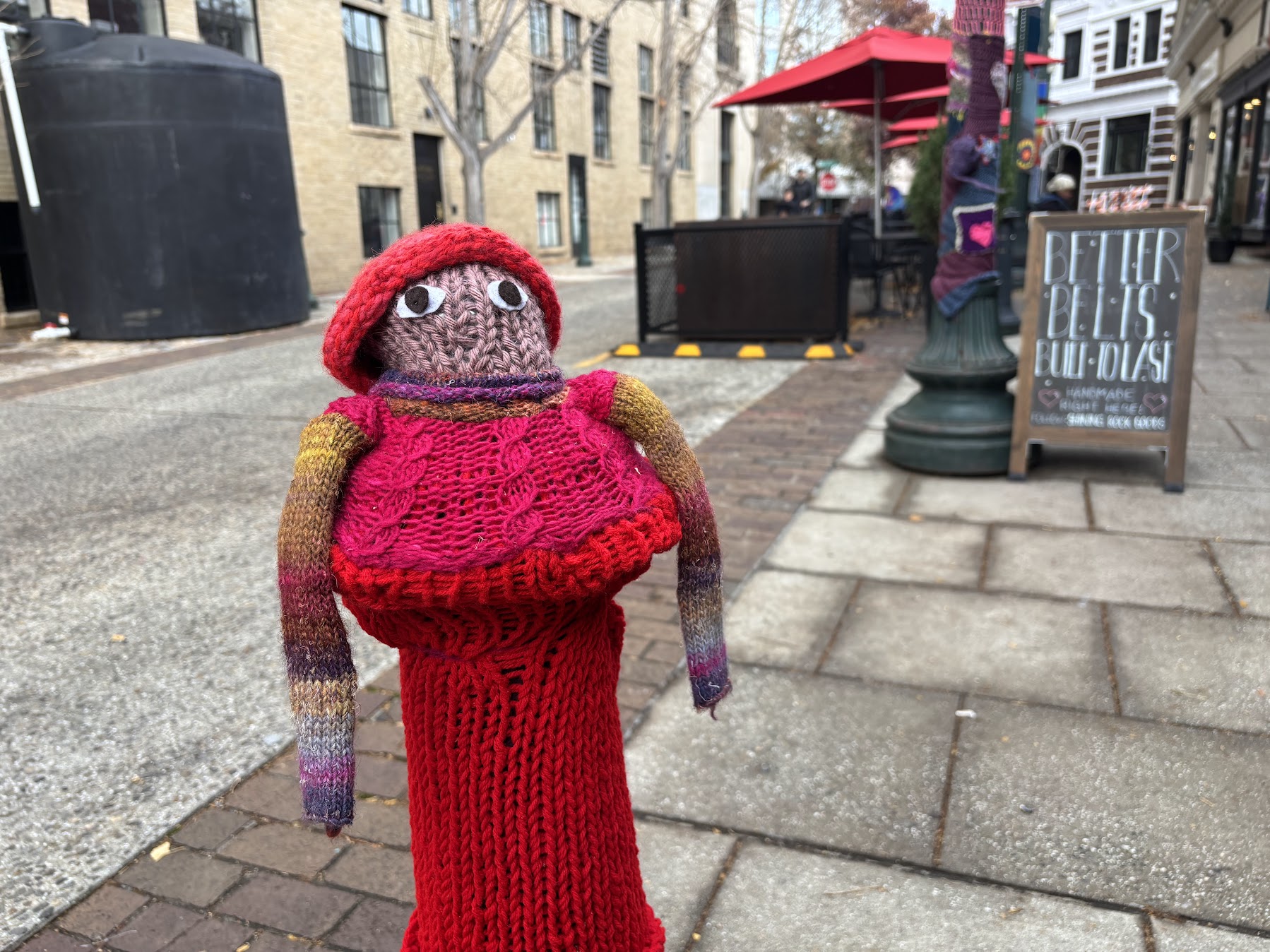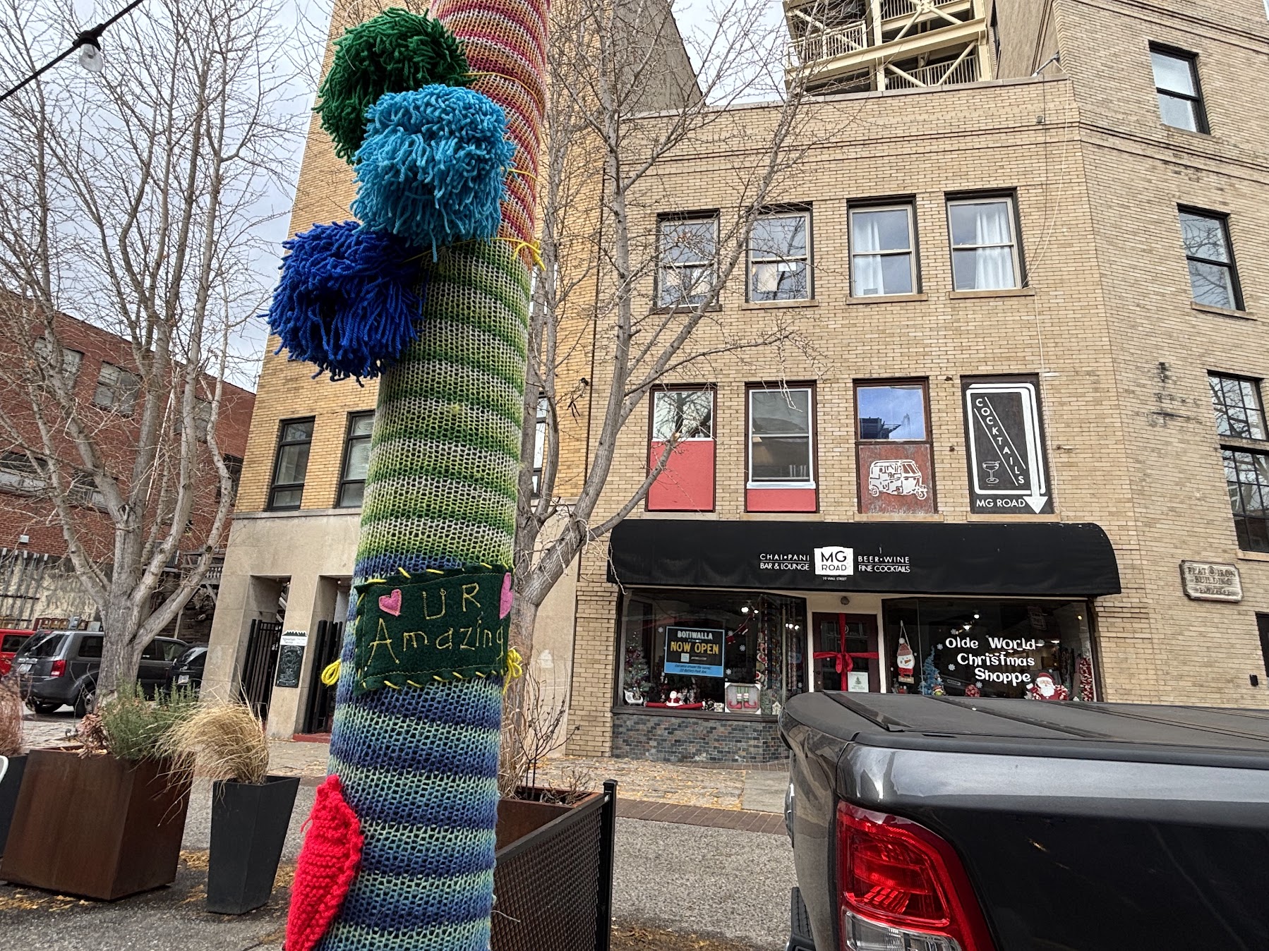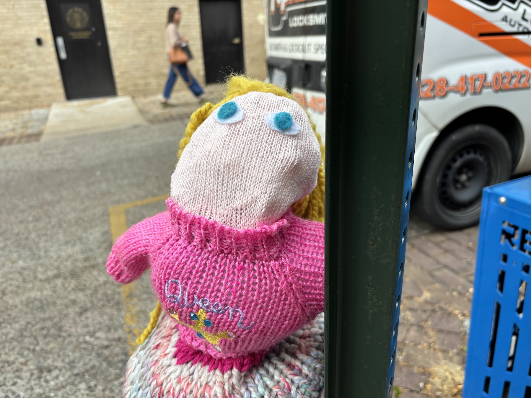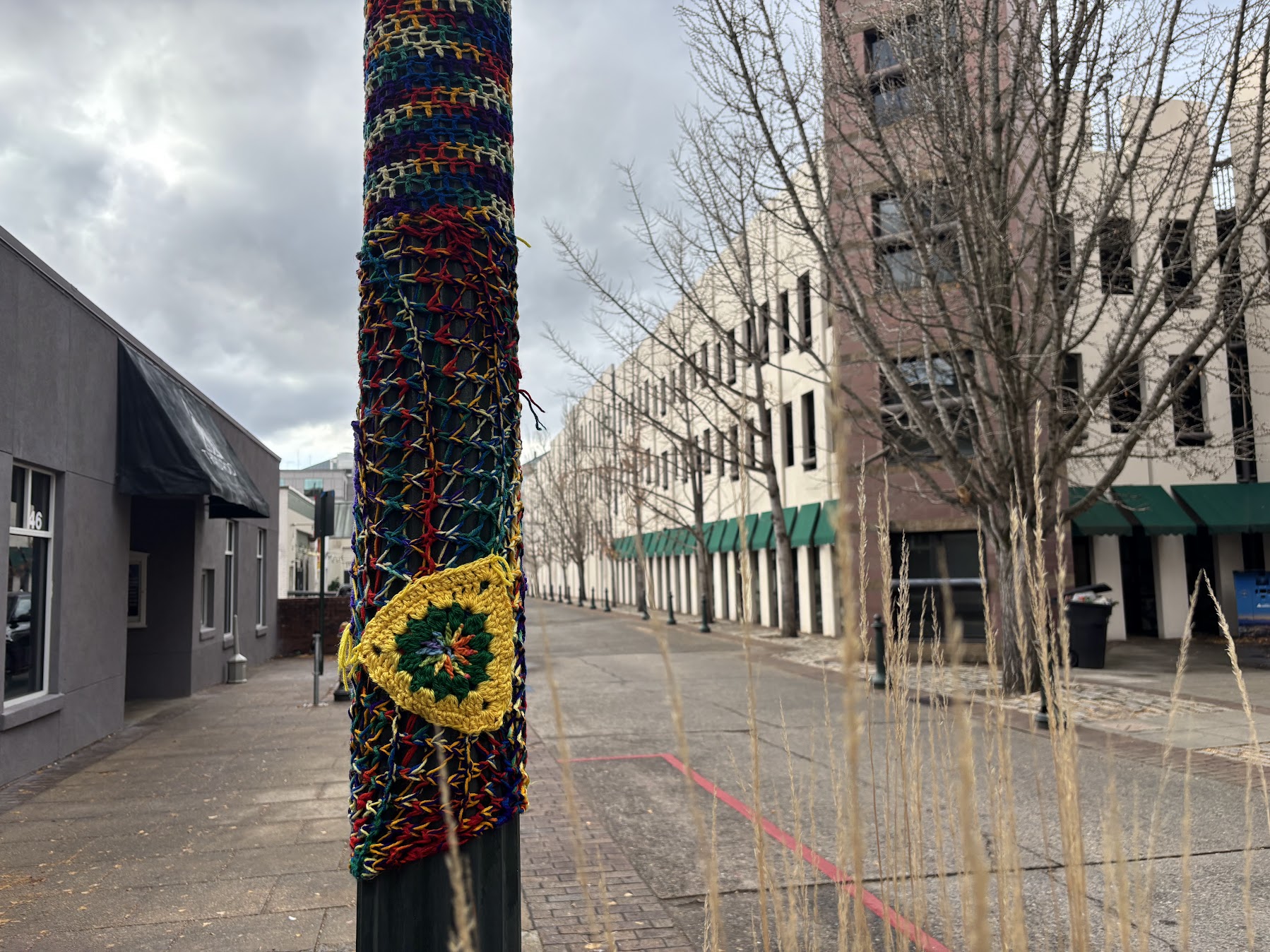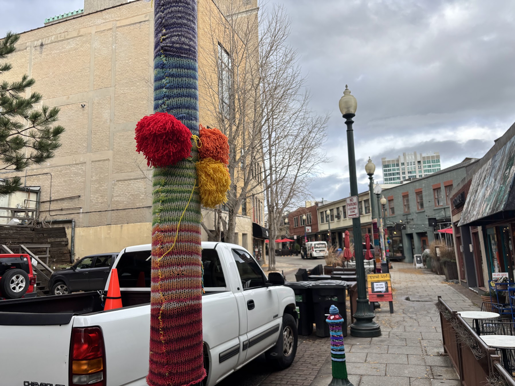The “Yarn Bomb of Love” on Wall Street in downtown Asheville is free to view for the community.