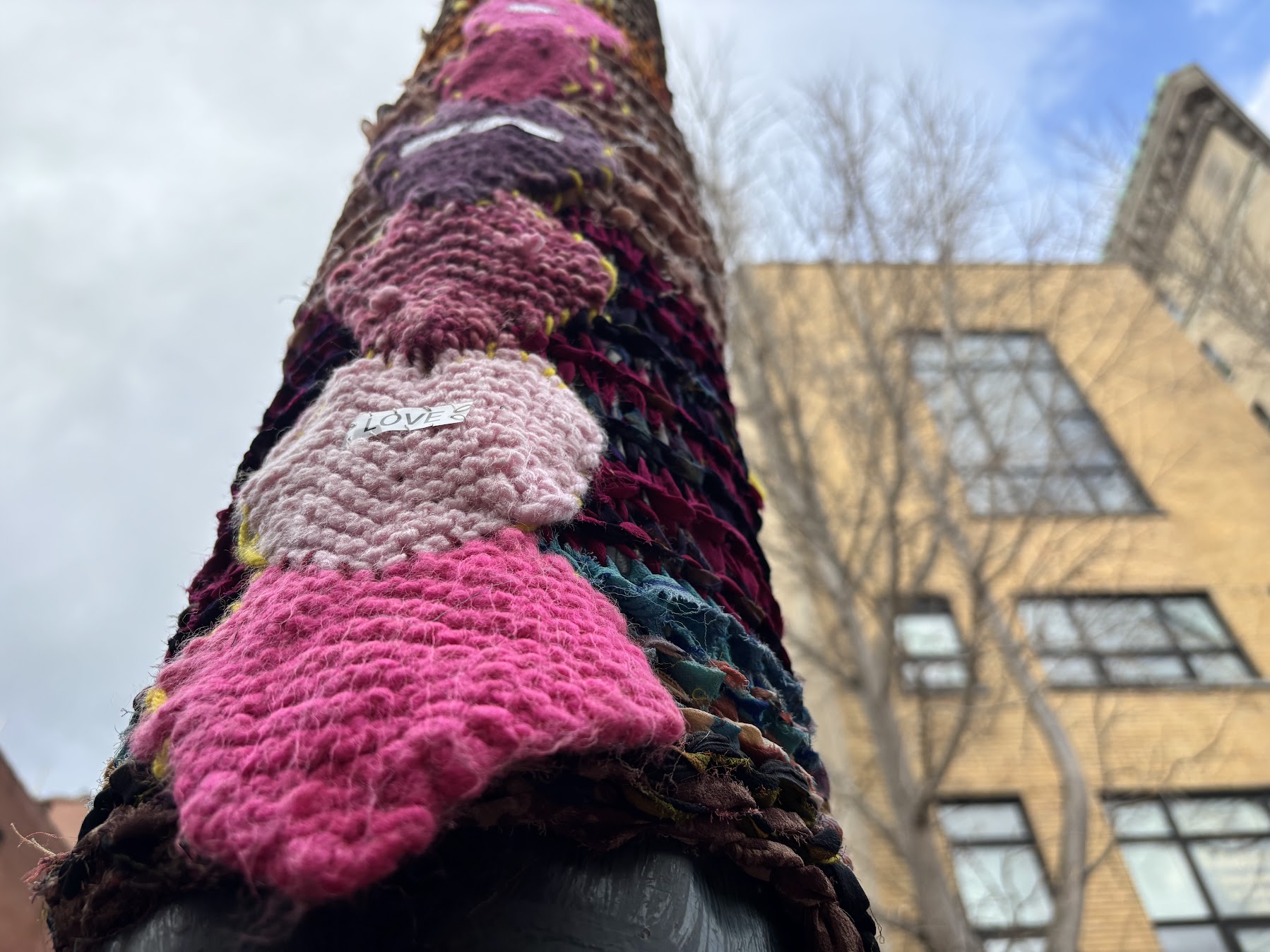 The knit project is dubbed the “Yarn Bomb of Love,” according to a signpost towards the end of Wall Street. It reports that the installation is the result of many nimble fingers at work.