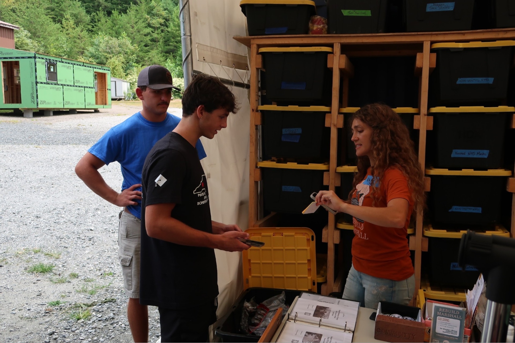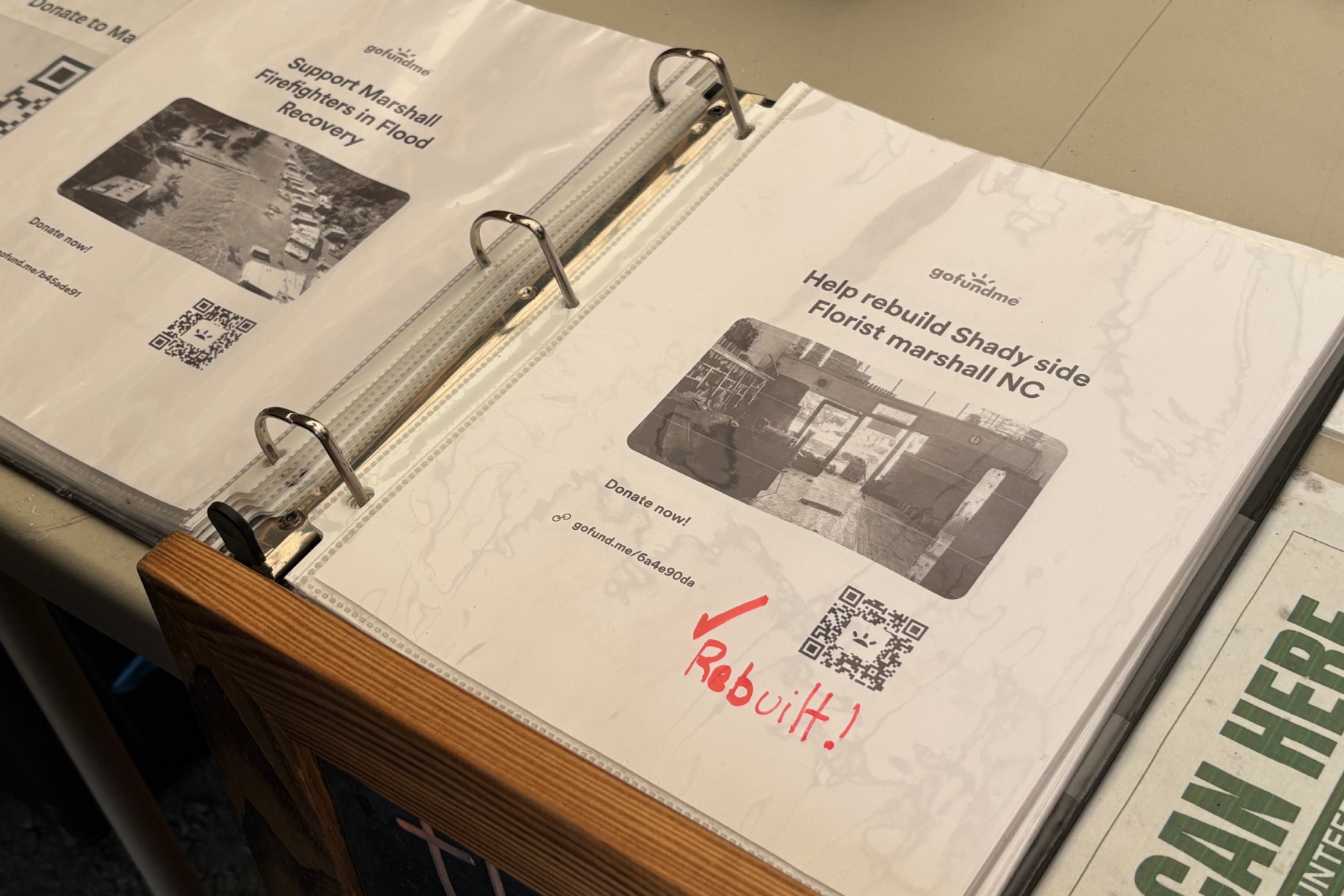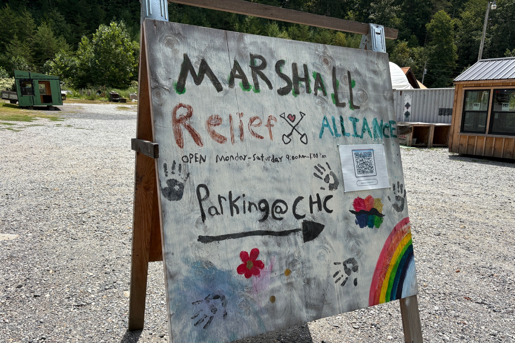“We were not an organization prior to Helene,” Tasha Pumphrey, the alliance’s executive director, said. “Once we started getting word of how bad Marshall was hit, a group of about six of us from Shelton Laurel loaded up some supplies, and came and set up shop here at Nanostead, which is a tiny house company. And we used their parking lot and we were going to grill some burgers. Before we even arrived, people were already waiting in the parking lot asking how to help.”