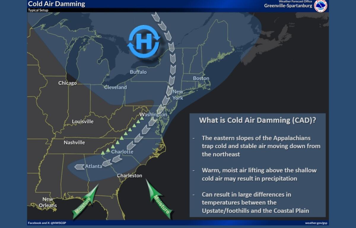 According to the National Weather Service in Greenville-Spartanburg, a phenomenon known as Cold Air Damming, or CAD, is keeping temperatures well below normal and fueling widespread showers across the mountains and foothills.