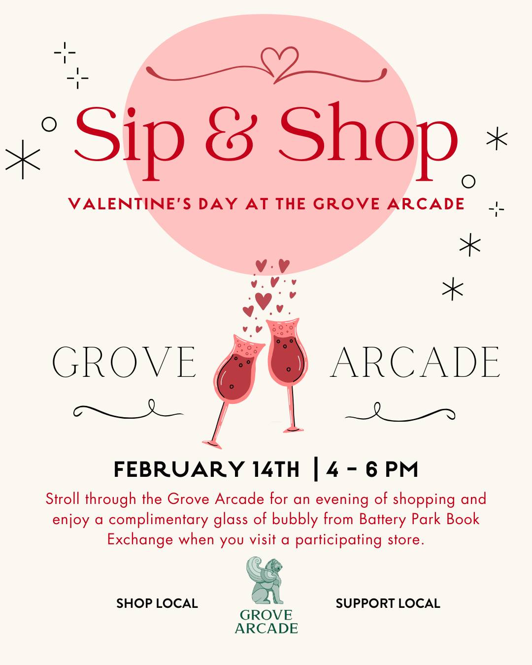 Grove Arcade will hold the Valentine’s Day Sip & Shop from 4-6 p.m. on Saturday, Feb. 14 throughout their downtown locale at 1 Page Ave.