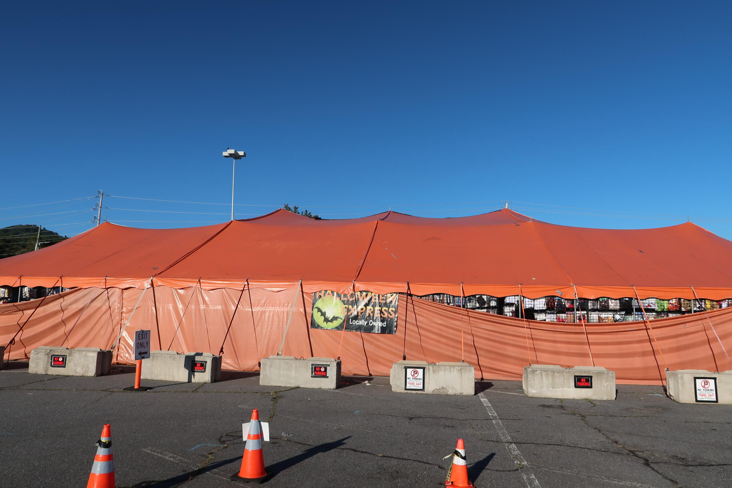 Known for its massive orange tent, Halloween Express features rows upon rows of costumes and spooky props for sale.