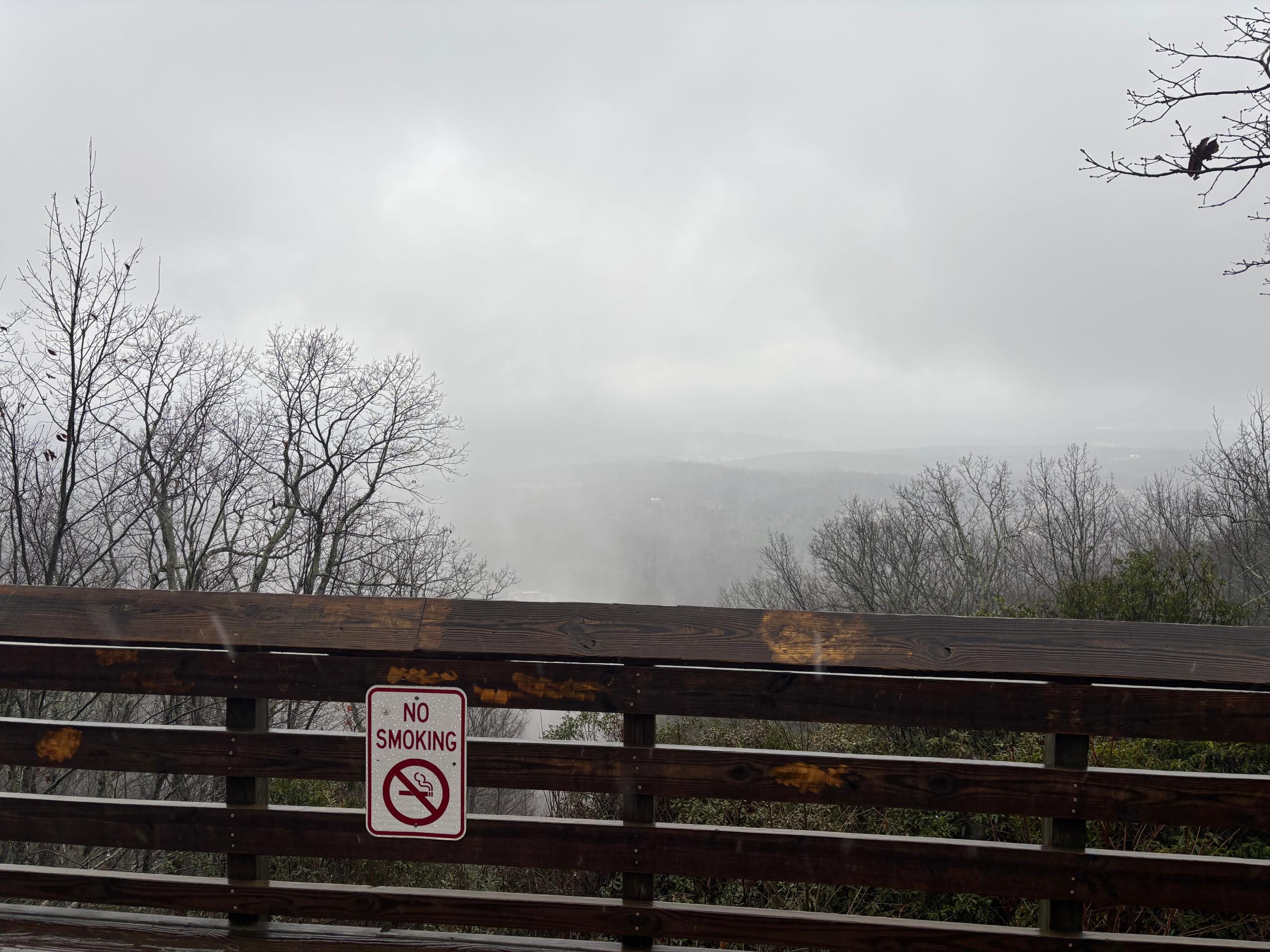 The top of the mountain is hard to miss. A spray painted blaze will show the way to the rest of the trail, but hike up from it toward a gazebo-like structure and the Bakers Mountain Observation Deck for a great view, especially on a clear day.