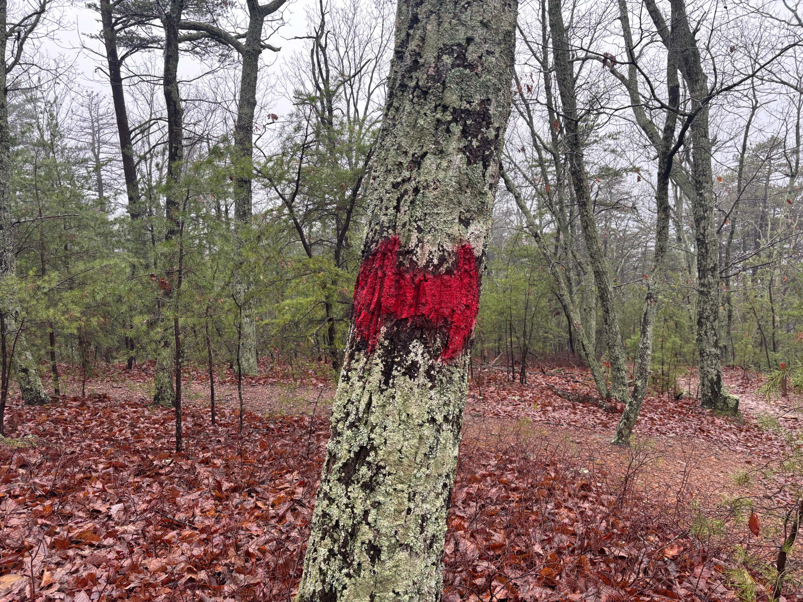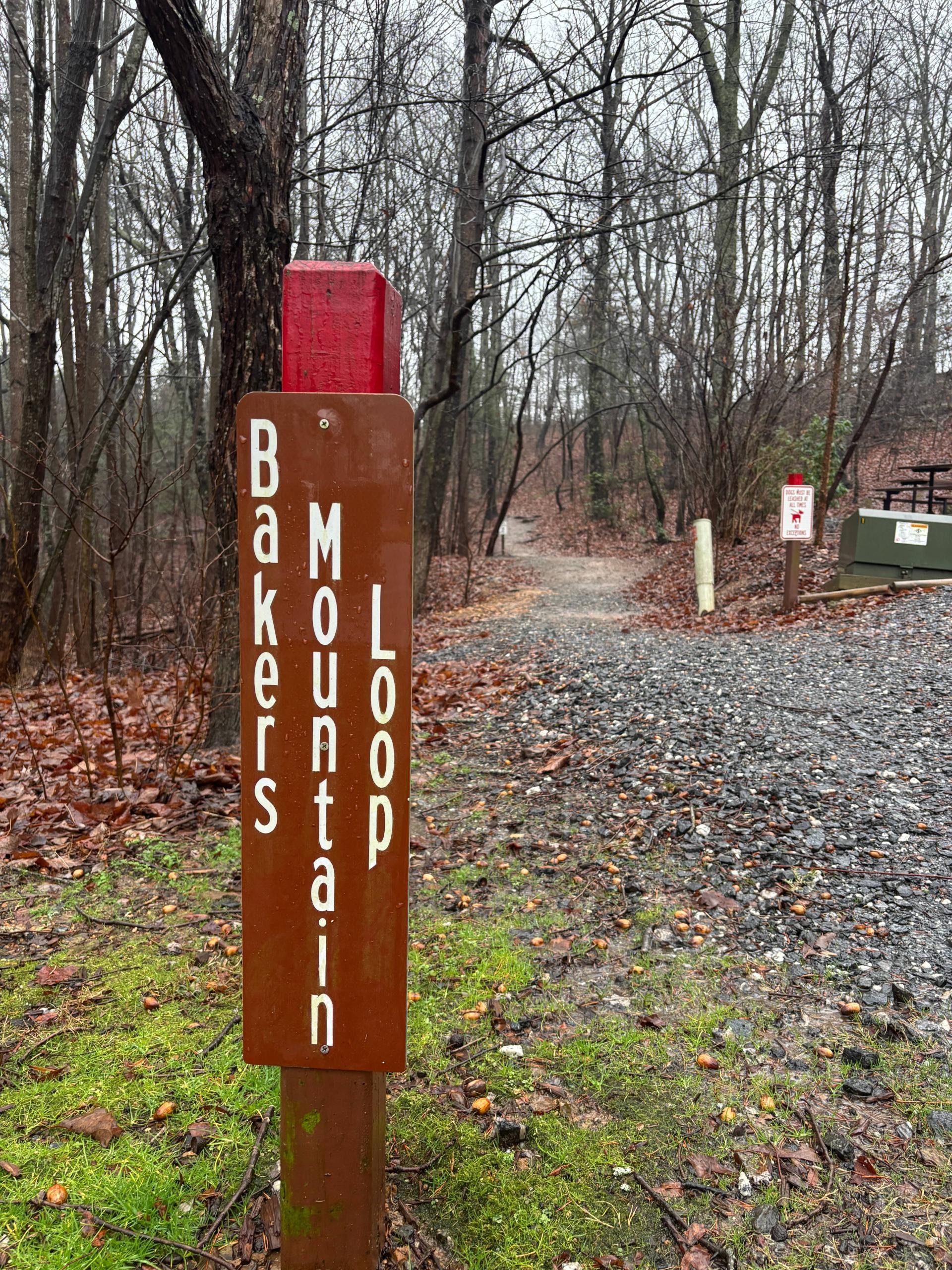 To start the hike, look for the first Bakers Mountain Loop blaze: a wooden post with a red top. These posts will lead the way at regular intervals during the climb.