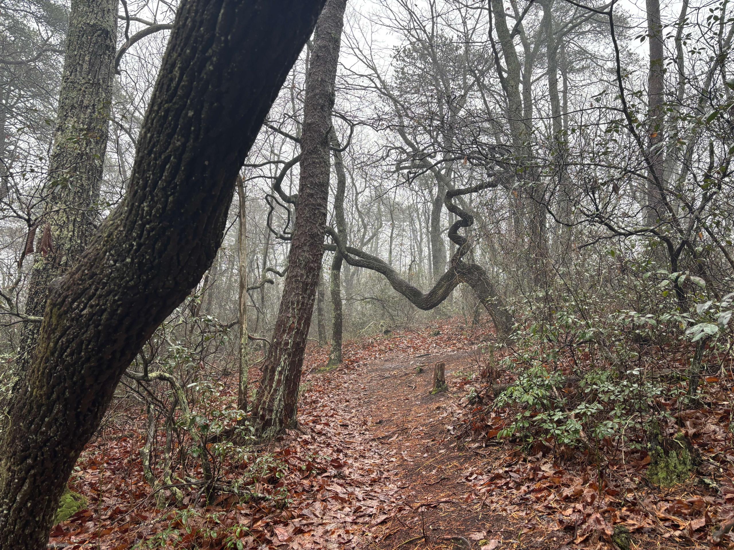 One of those plaques was about a gnarled tree in a corkscrew shape along the looping route. According to the sign, the sourwood tree is referred to as “the crooked tree” by frequent Bakers Mountain hiker Tom Abernathy, who has roamed the Bakers Mountain woods “nearly every day” since its opening in 2002.