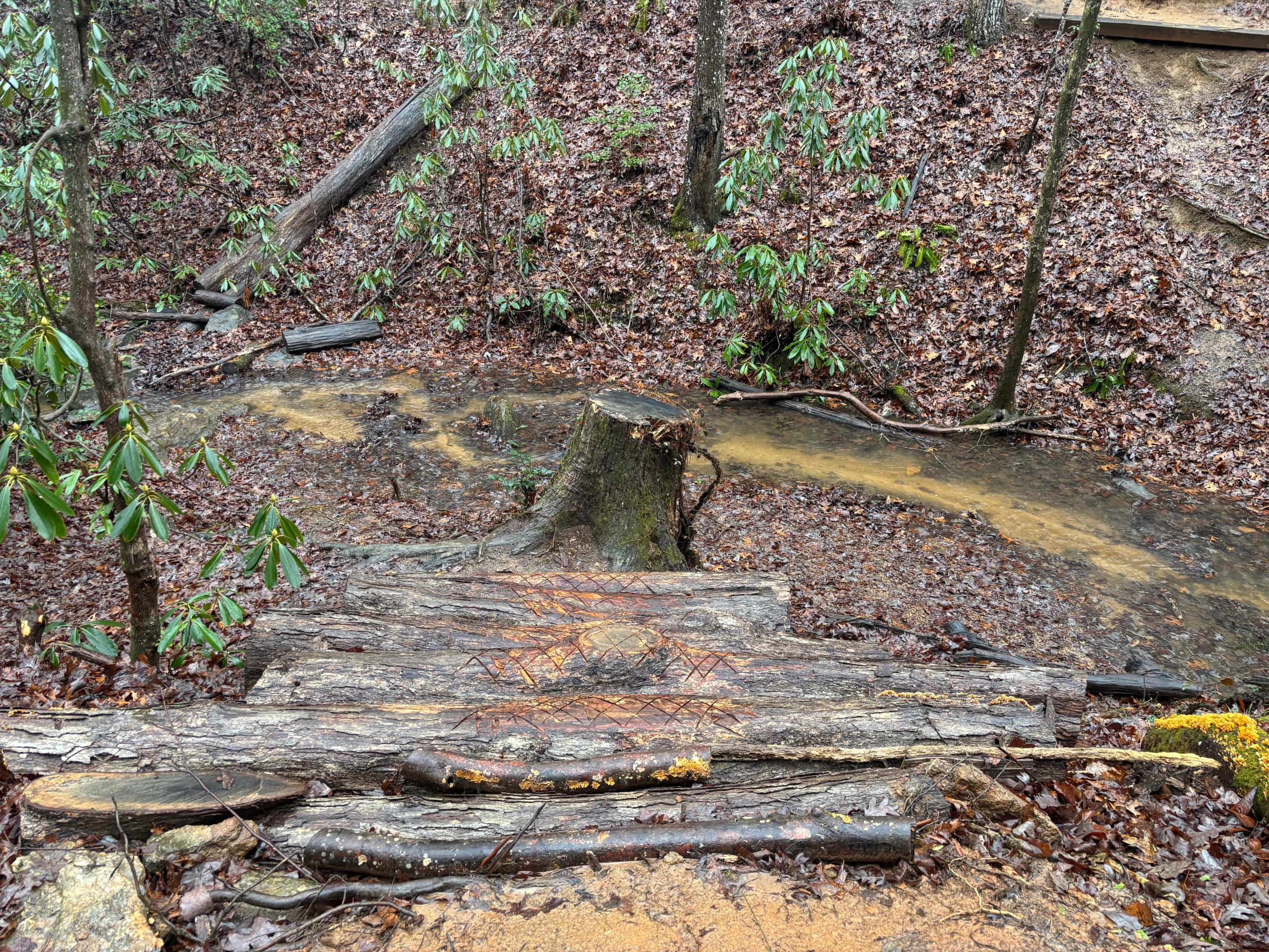 One fun feature of the second half of the Bakers Mountain Loop trail is a creekside section. The creek is accessible to hikers via a series of scored log steps, but lacking rails, necessitating sure footing.