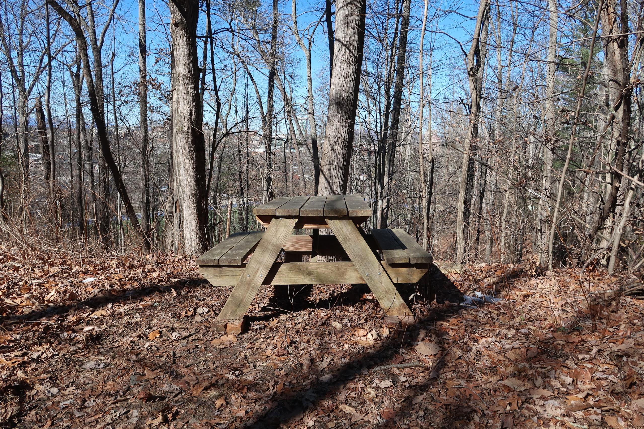 Doubling back, head down the path in the other direction, passing the entrance you took to the ridge. Along the trail, there are several picnic tables and stone lookout benches available to rest on.