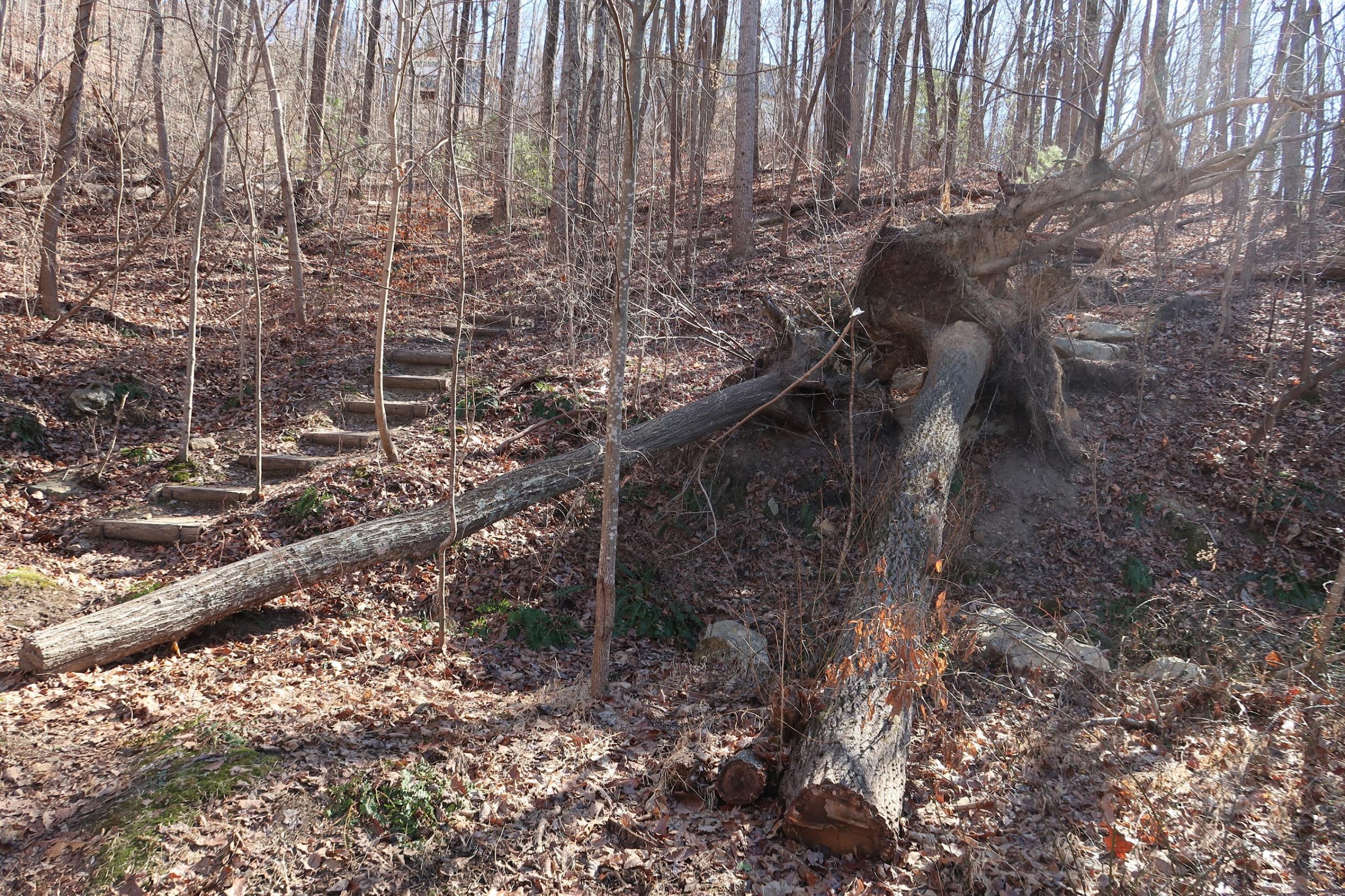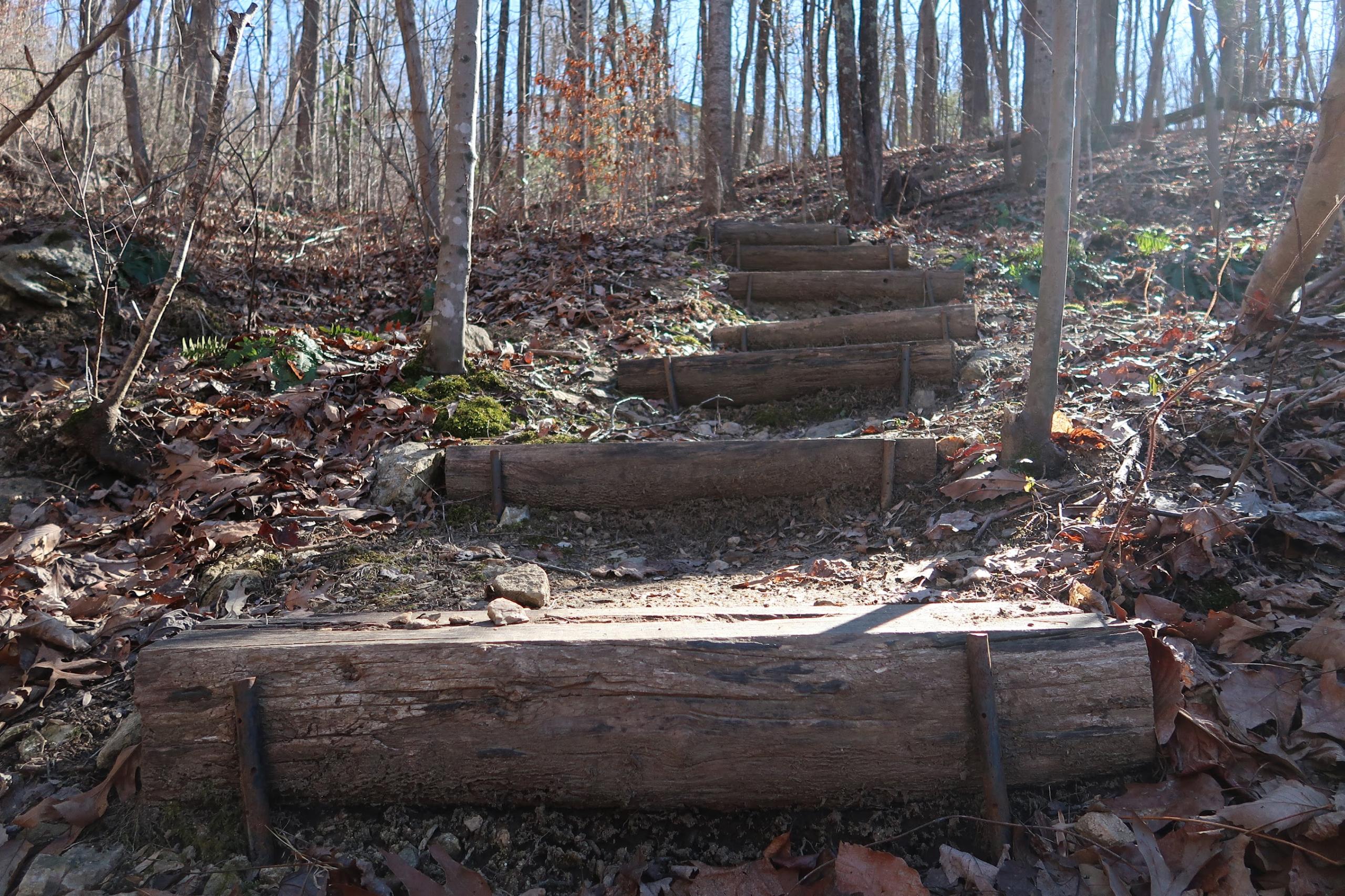 Headed to the right, the trail butts up against a gate at the end of White Fawn Drive. One fun, brief side adventure to take is the log staircase right before the gate. While it ends with a private property sign, it is a fun bit of extra exercise and permits some scenic views at the mountain slope below.