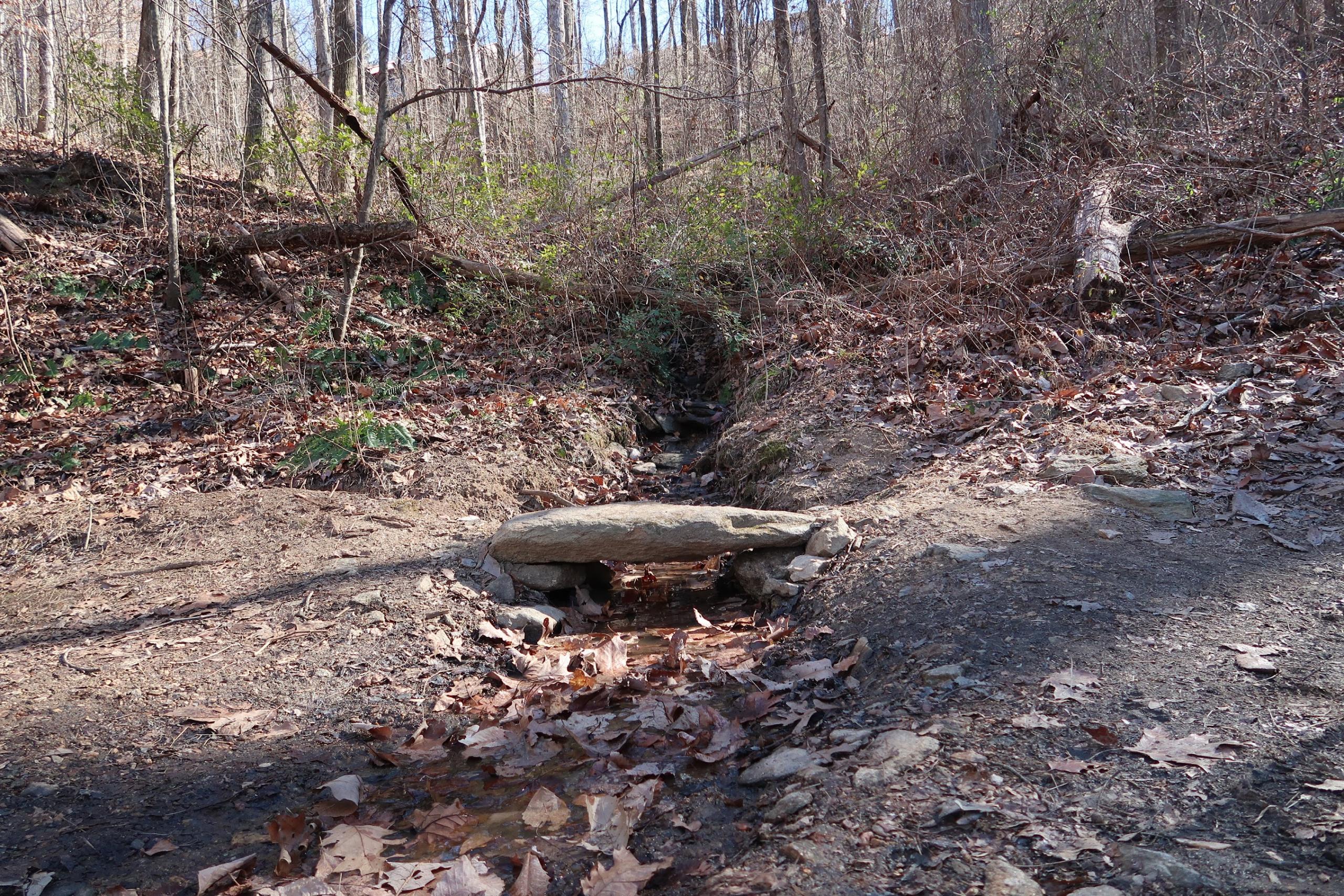 Back on the main trail, pass by the right turn up to the next major leg of the mountain, marked by a stone wall and a small creek preceding a right turn up the mountain. Keep going down the path to reach the second terminus, this one intersecting with Ardmion Park.