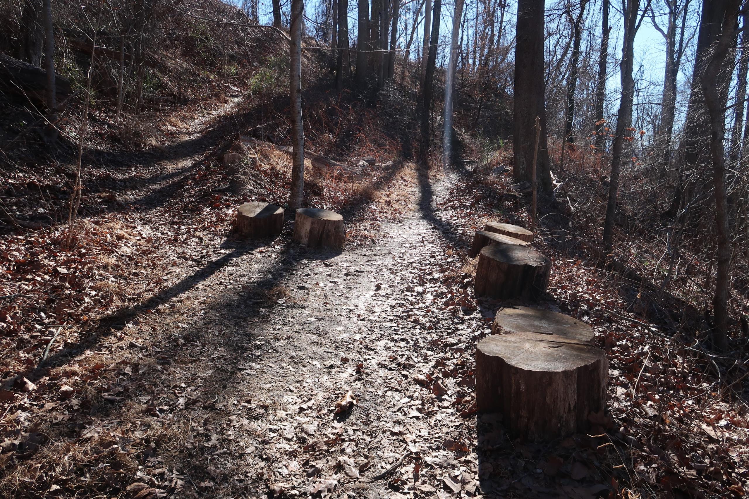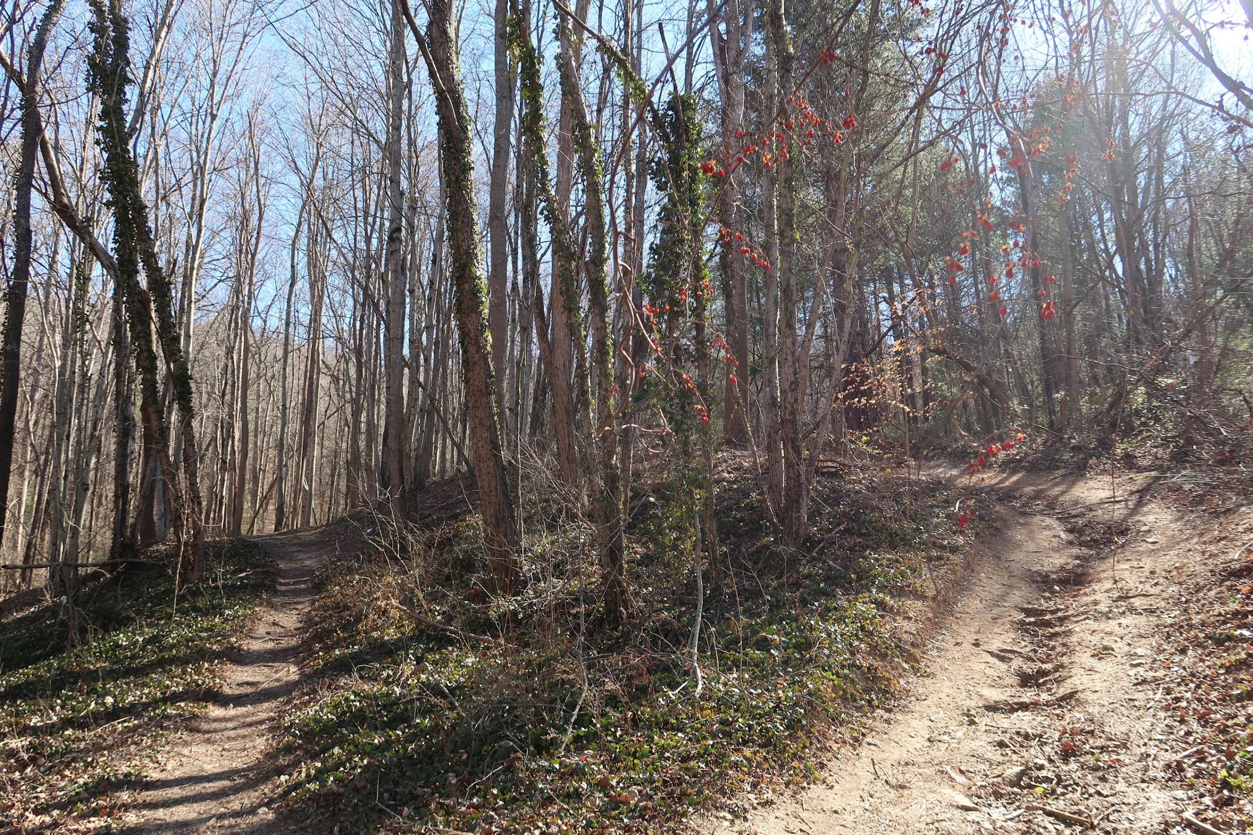 The first of these comes after the first major push from the beginning of the trail to the top of a ridge. Here, the trail will spit you out onto a wide dirt avenue, with trees reaching skyward on either side.