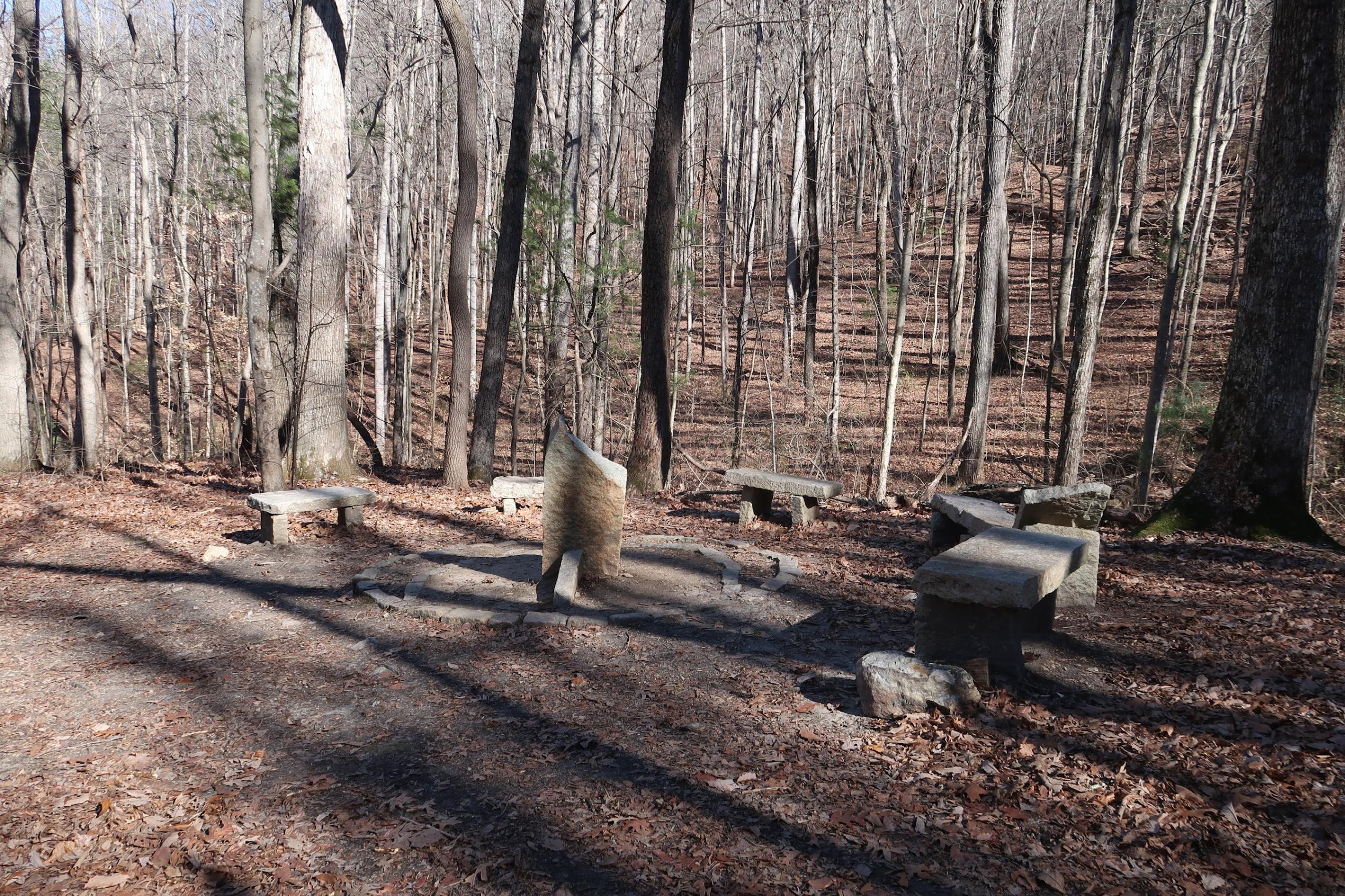 The next fun diversion is a downhill path leading to a semicircle of stone benches surrounding a sundial-shaped structure. I loved the little spot for its resemblance to a meeting place for wizards or forest elves. The Council of Elrond, anyone?